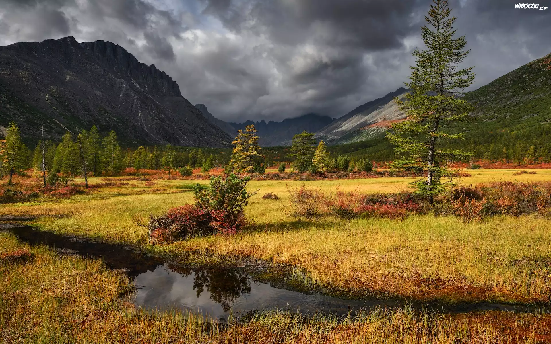 Rosja, Kołyma, Góry, Rzeka, Łąka, Drzewa, Jesień, Chmury