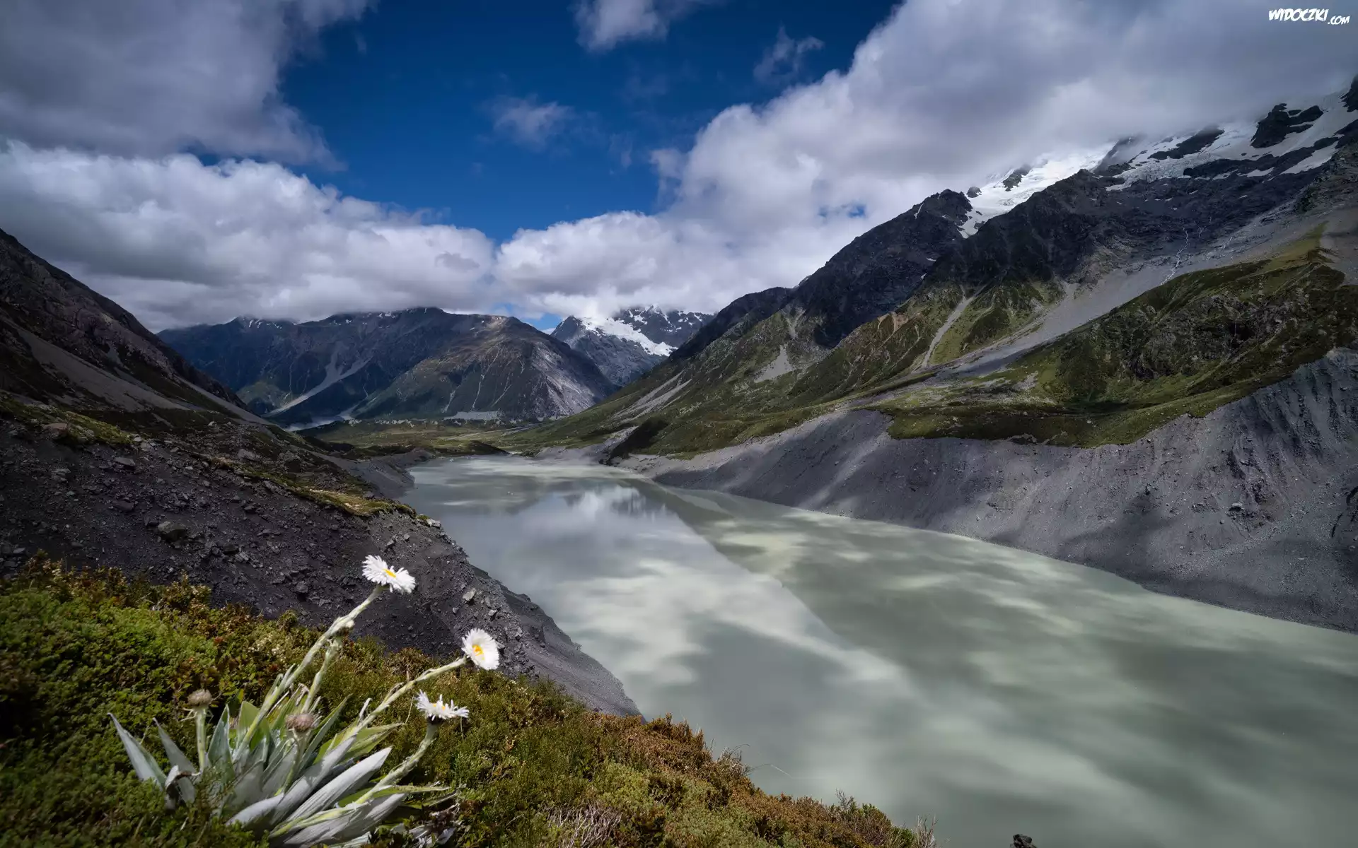 Zdjęcia, Góry, Jezioro, Kwiaty, Chmury