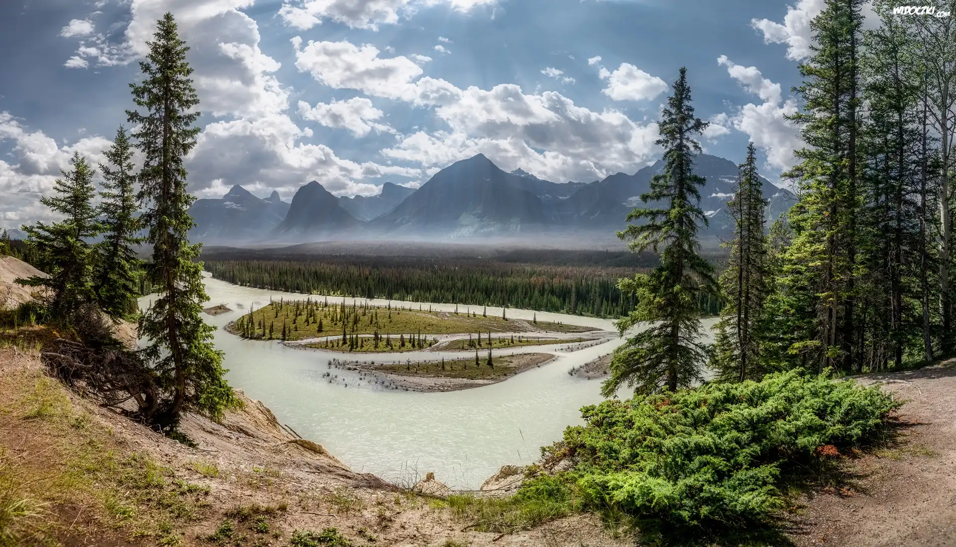 Zdjęcia, Kanada, Park Narodowy Jasper, Góry, Rzeka Athabaska, Las, Drzewa, Chmury