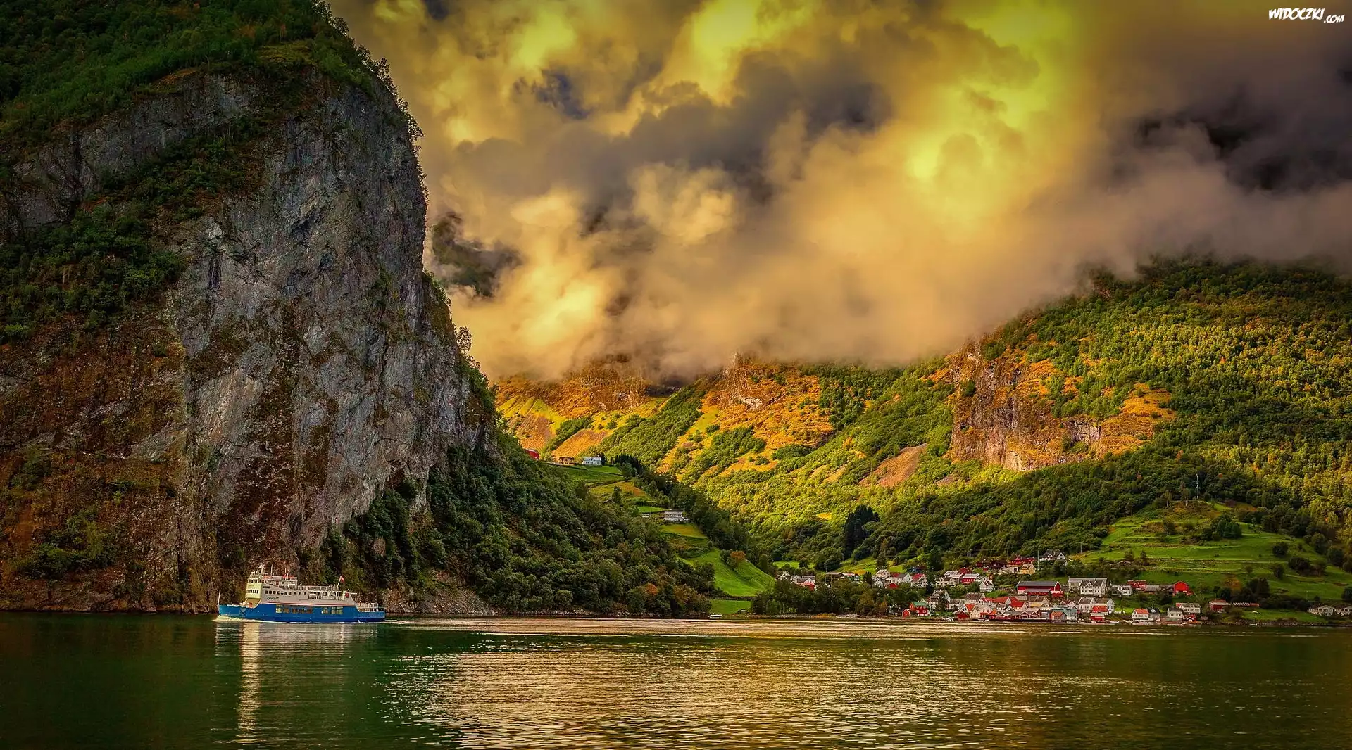 Góry, Chmury, Woda, Statek, Osada, Geirangerfjord, Norwegia