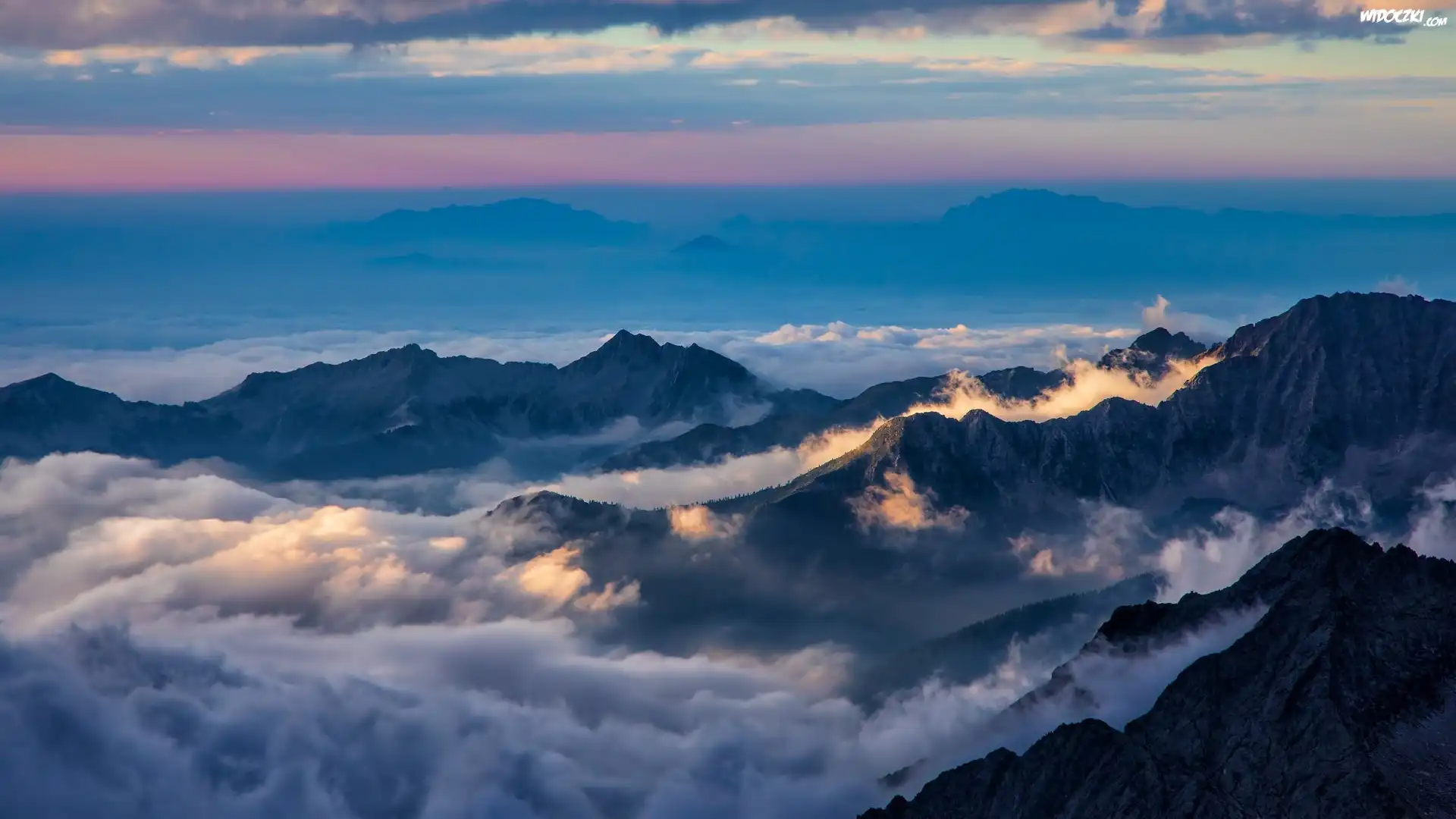Zdjęcia, Góry, Szczyty, Opadające, Chmury