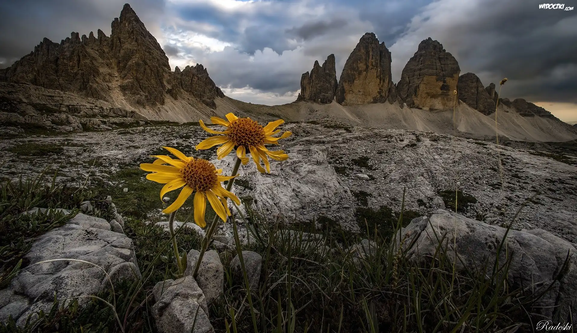 Zdjęcia, Góry, Dolomity, Skały, Żółte, Kwiaty, Chmury, Masyw Tre Cime di Lavaredo, Włochy