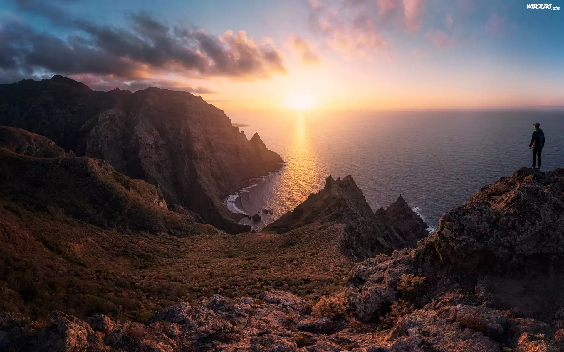Morze, Wybrzeże, Góry, Skały, Człowiek, Wschód słońca, Chmury