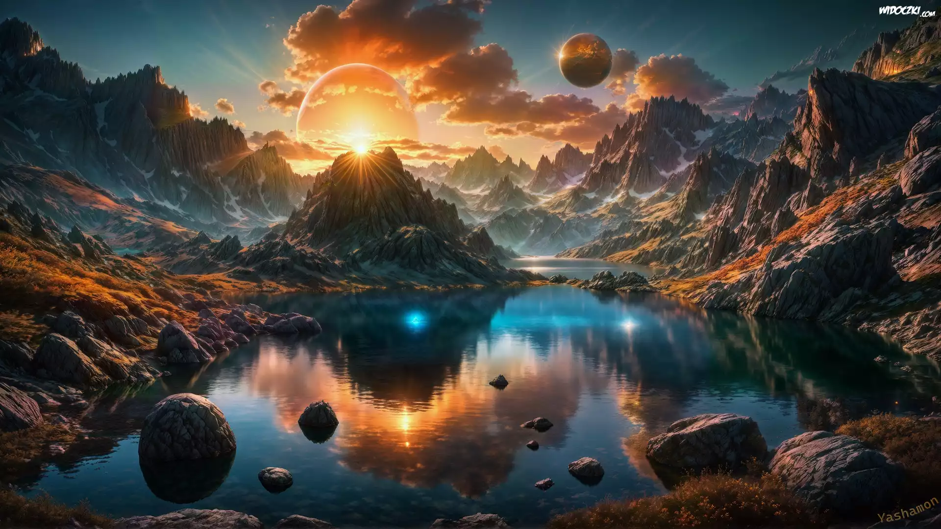 Góry, Skały, Jezioro, Chmury, Odbicie, Grafika