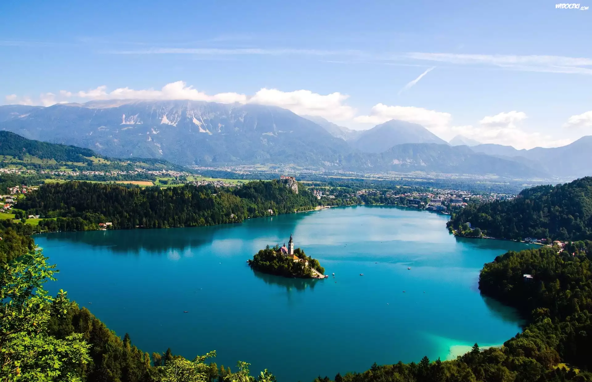 Zdjęcia, Słowenia, Góry Alpy Julijskie, Jezioro Bled, Wyspa Bled, Drzewa, Chmury