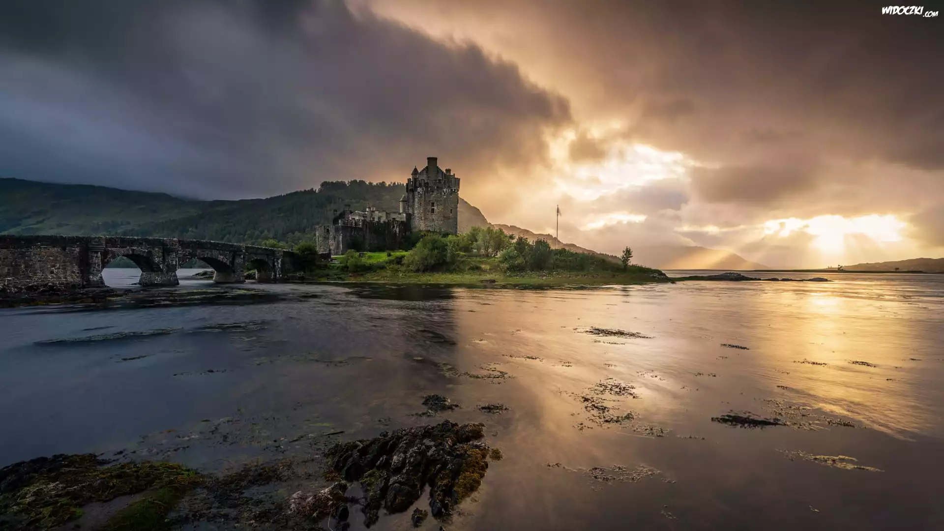 Szkocja, Zamek, Eilean Donan, Jezioro, Most, Drzewa, Zachód słońca, Chmury