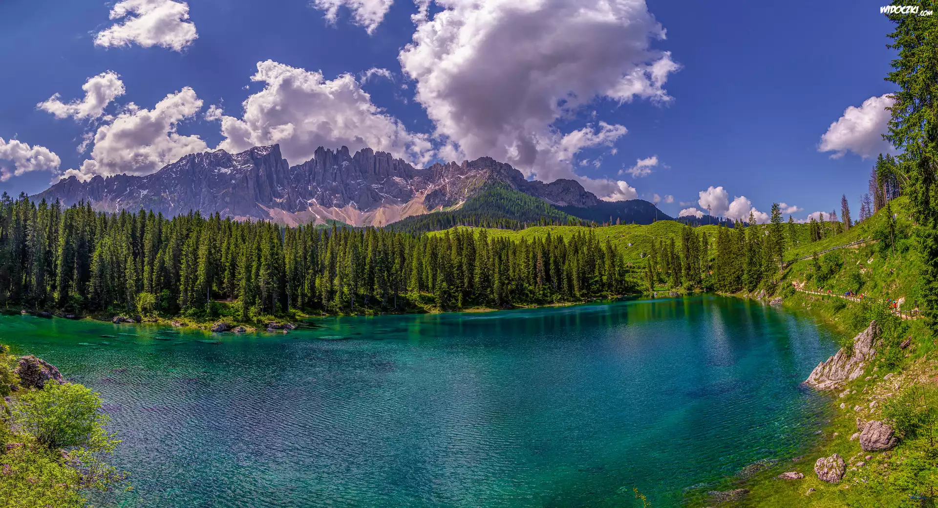 Zdjęcia, Jezioro, Drzewa, Góry, Chmury