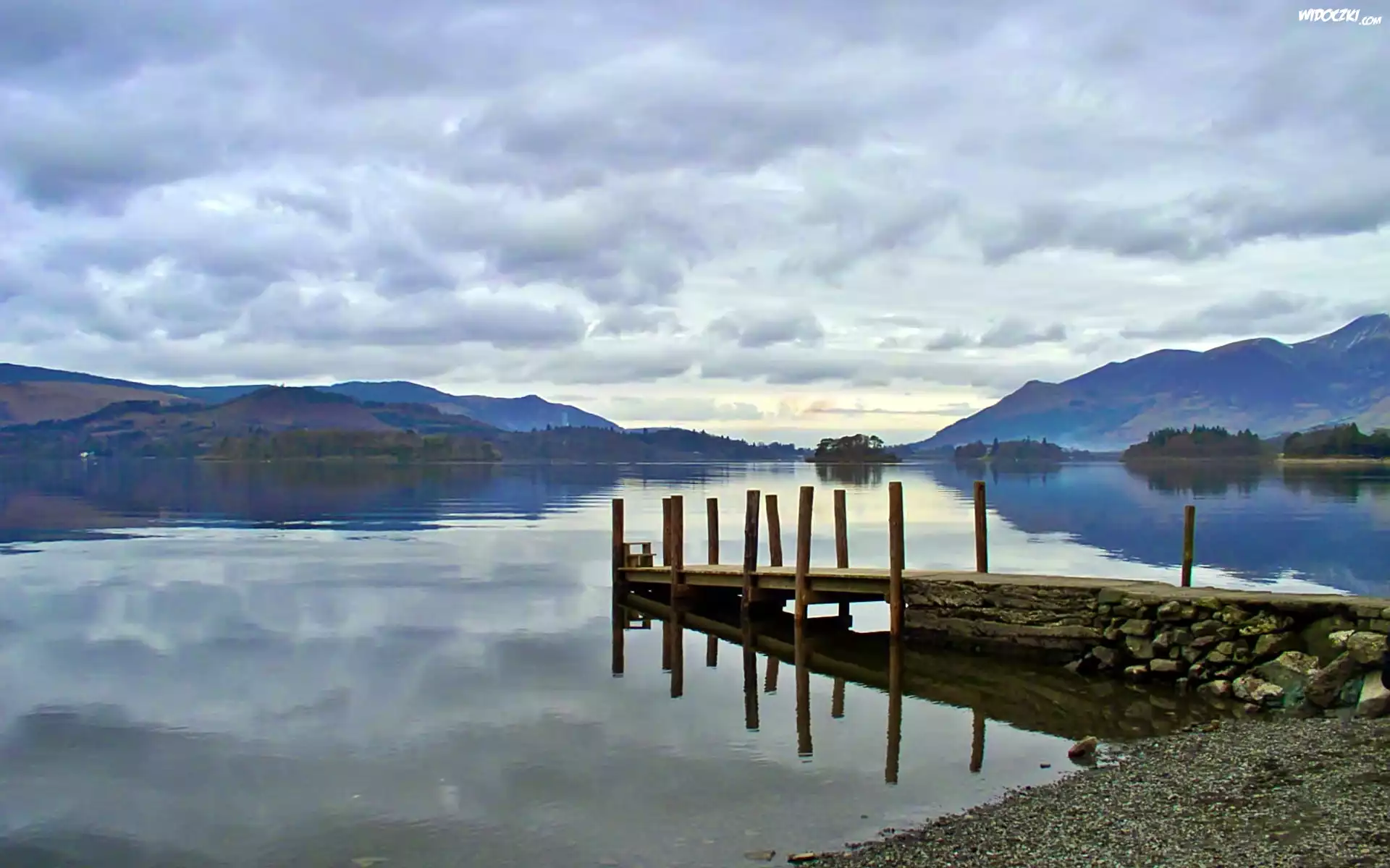 Zdjęcia, Chmury, Góry, Jezioro, Pomost