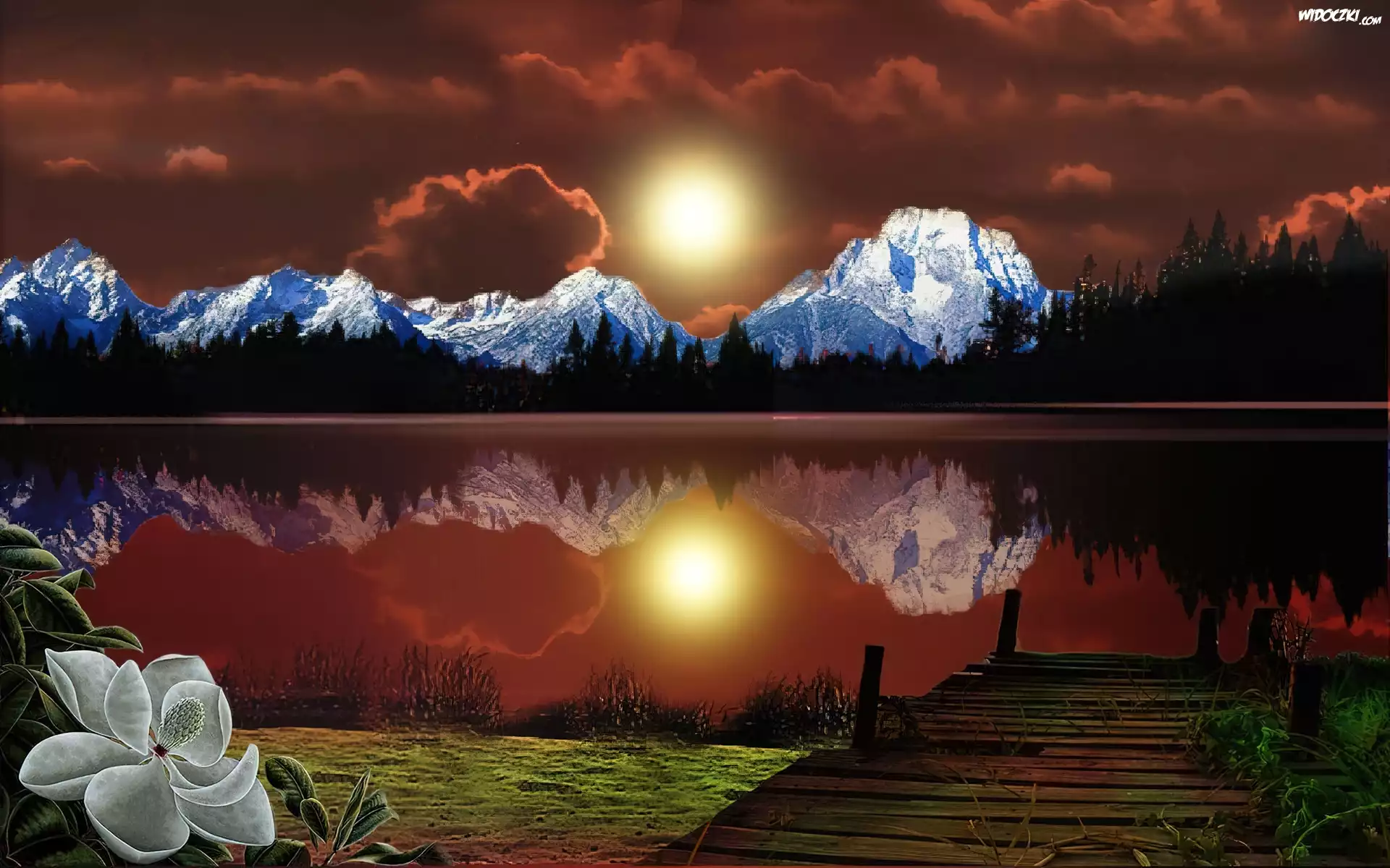 Chmury, Słońce, Góry, Jezioro, Kwiat