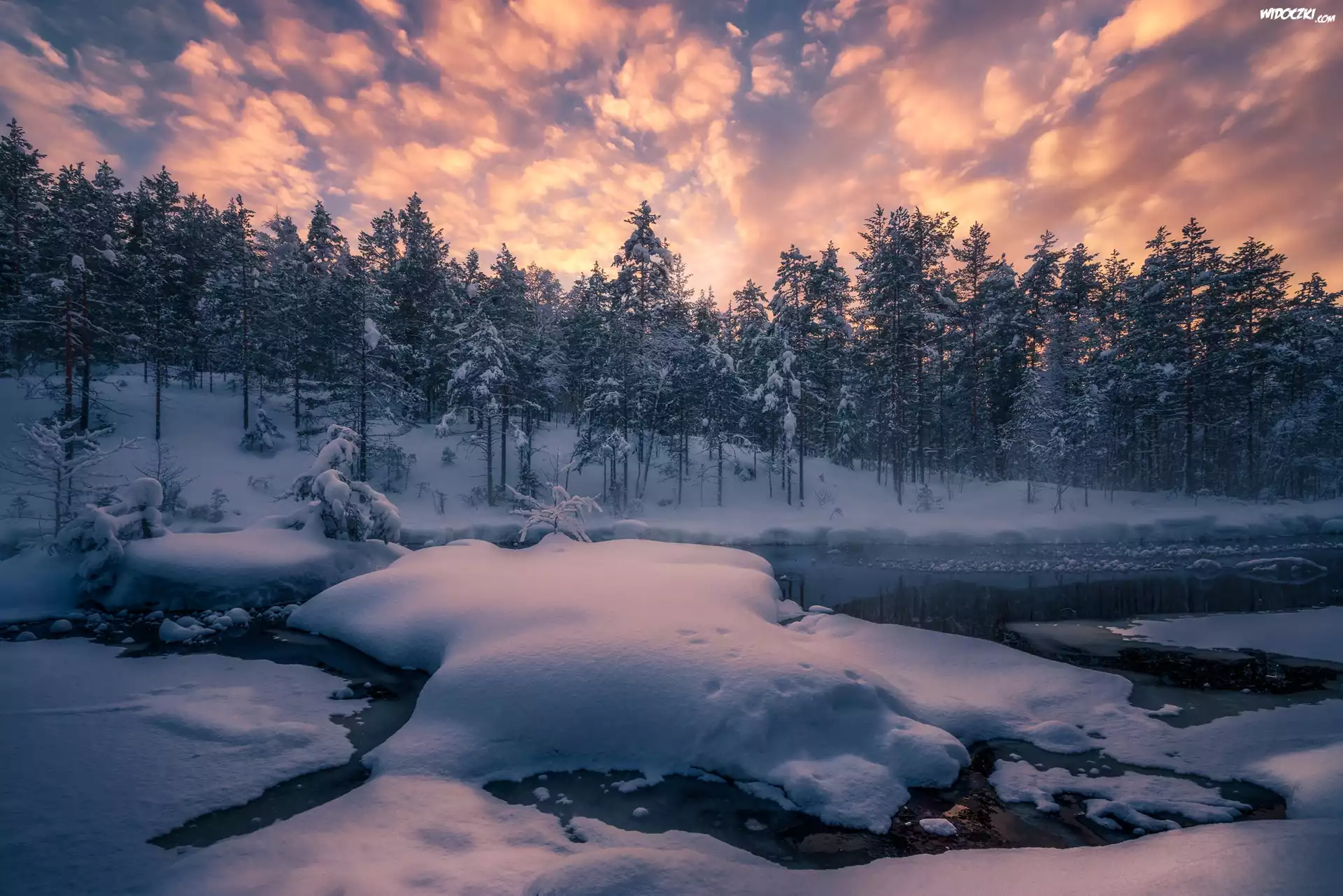Norwegia, Gmina Ringerike, Zima, Jezioro, Drzewa, Las, Zachód słońca, Chmury