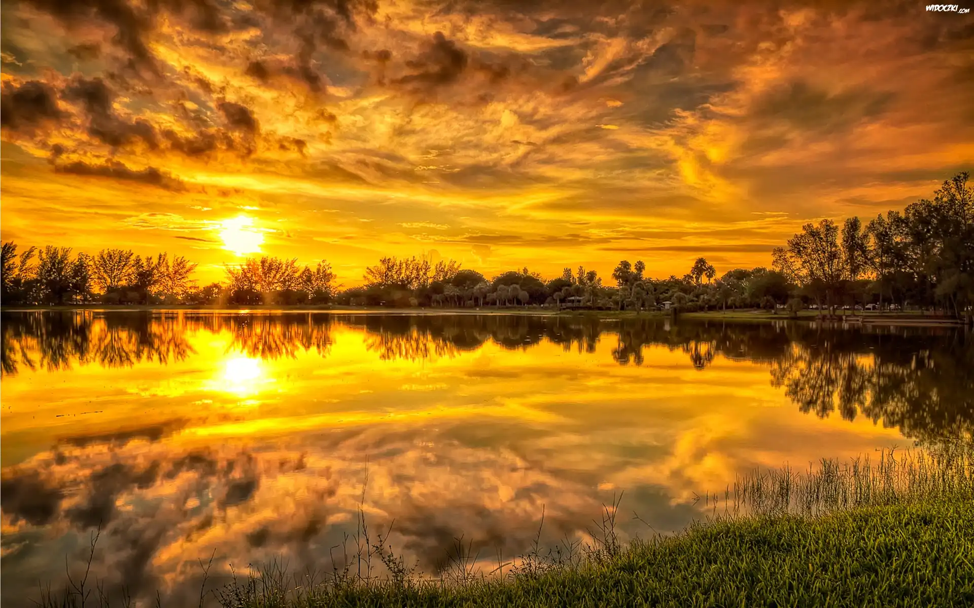 Chmury, Zachód, Słońca, Jezioro, Drzewa
