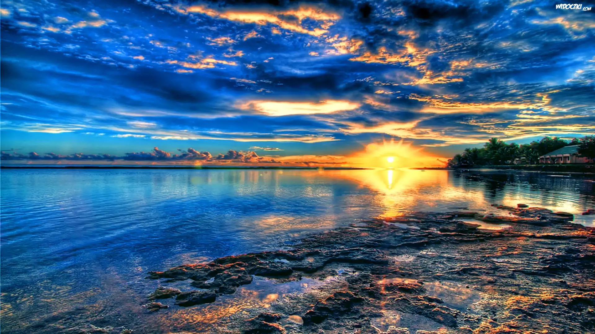 Jezioro, Chmury, Słońce