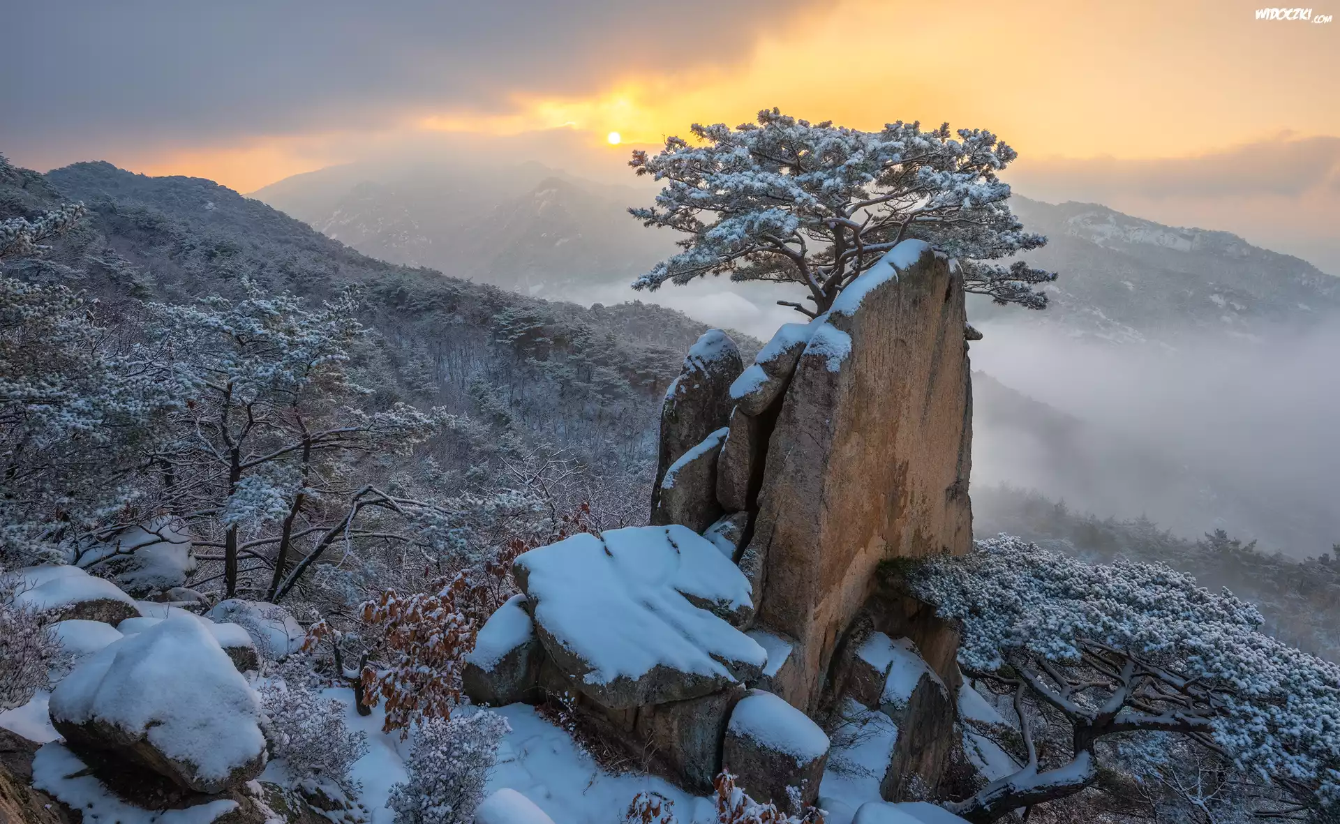 Zdjęcia, Zima, Śnieg, Góry, Drzewo, Kamienie, Skały, Zachód słońca, Mgła, Chmury