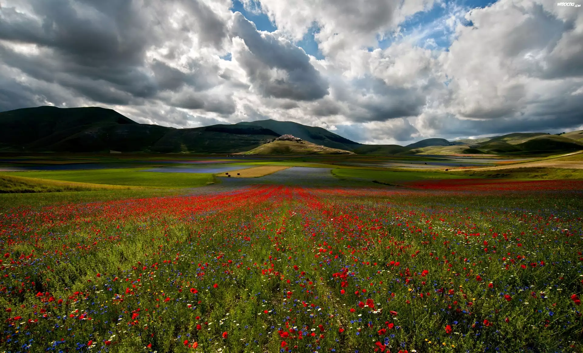 Zdjęcia, Chmury, Łąka, Kwiaty, Wzgórza