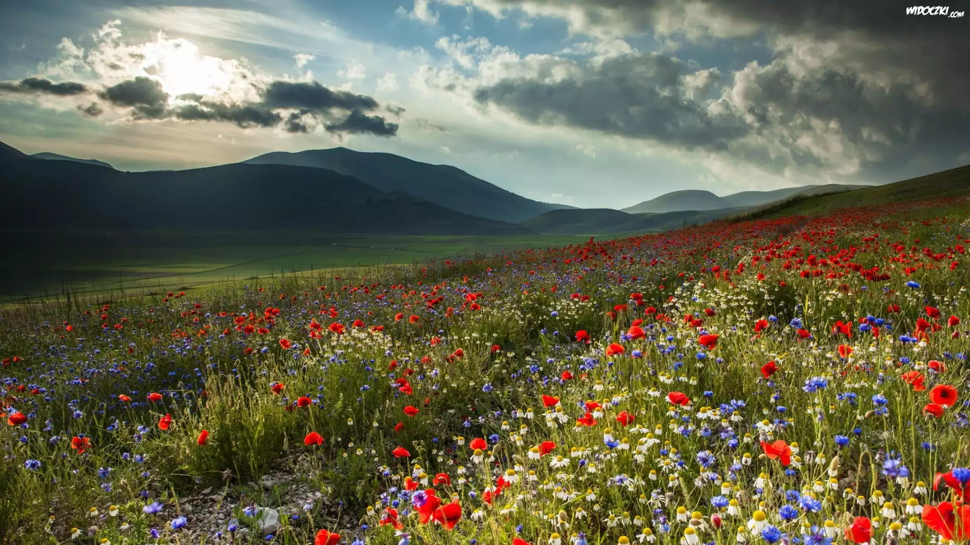 Zdjęcia, Łąka, Kwiaty, Chmury, Wzgórza