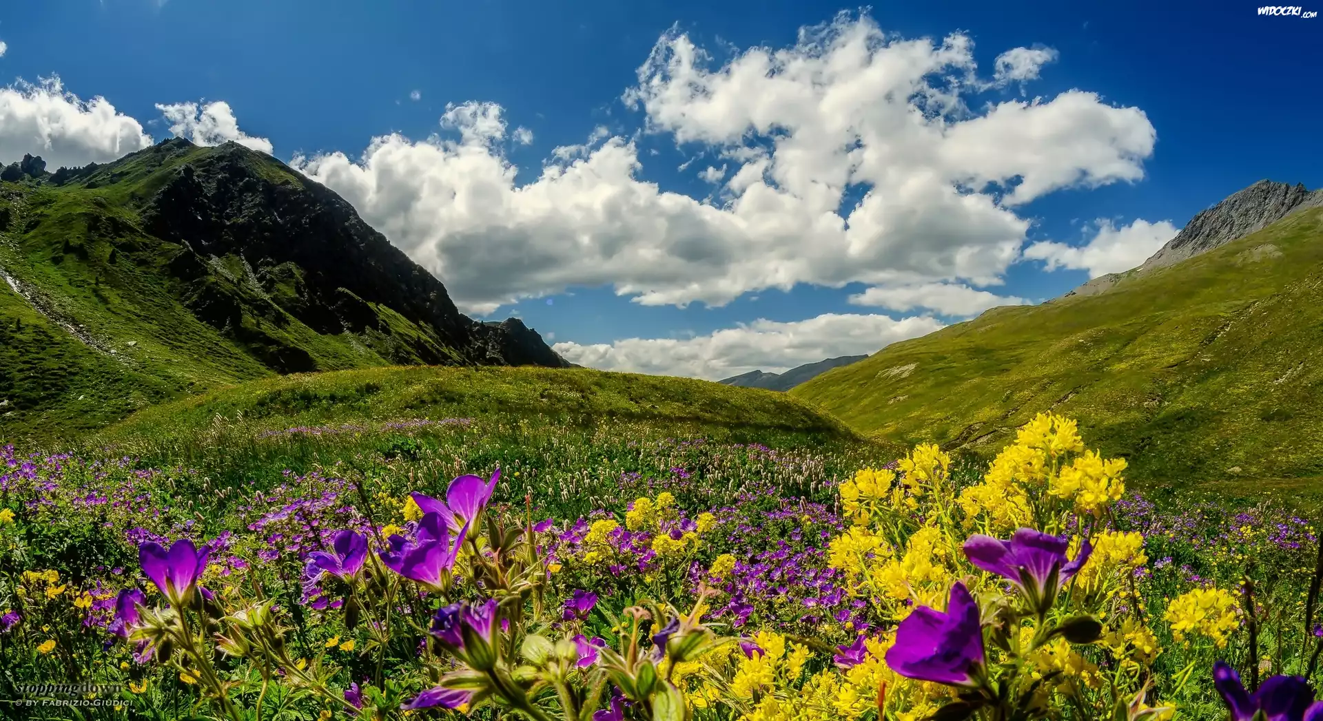 Zdjęcia, Łąka, Kwiaty, Góry, Chmury, Wiosna