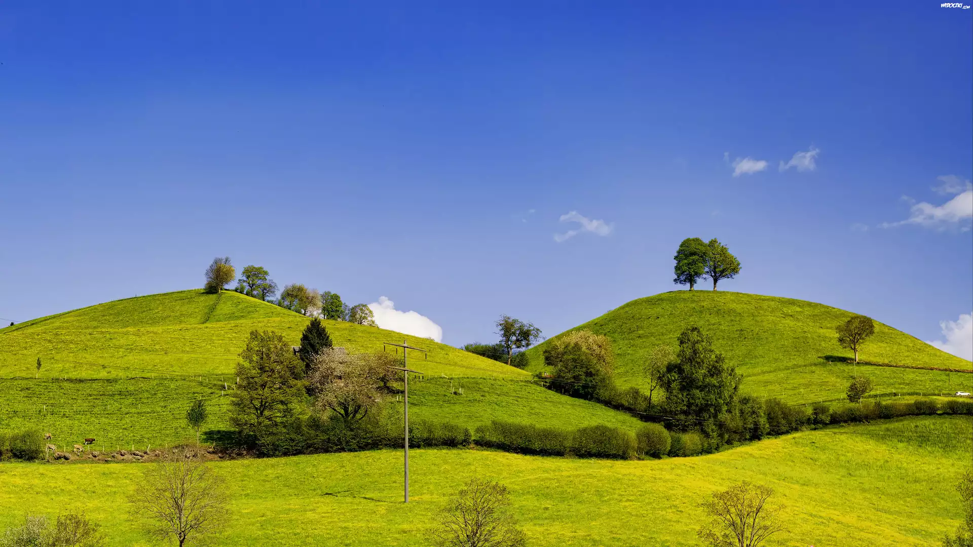 Wzgórza, Pole, Drzewa, Chmury, Krajobraz, Łąka