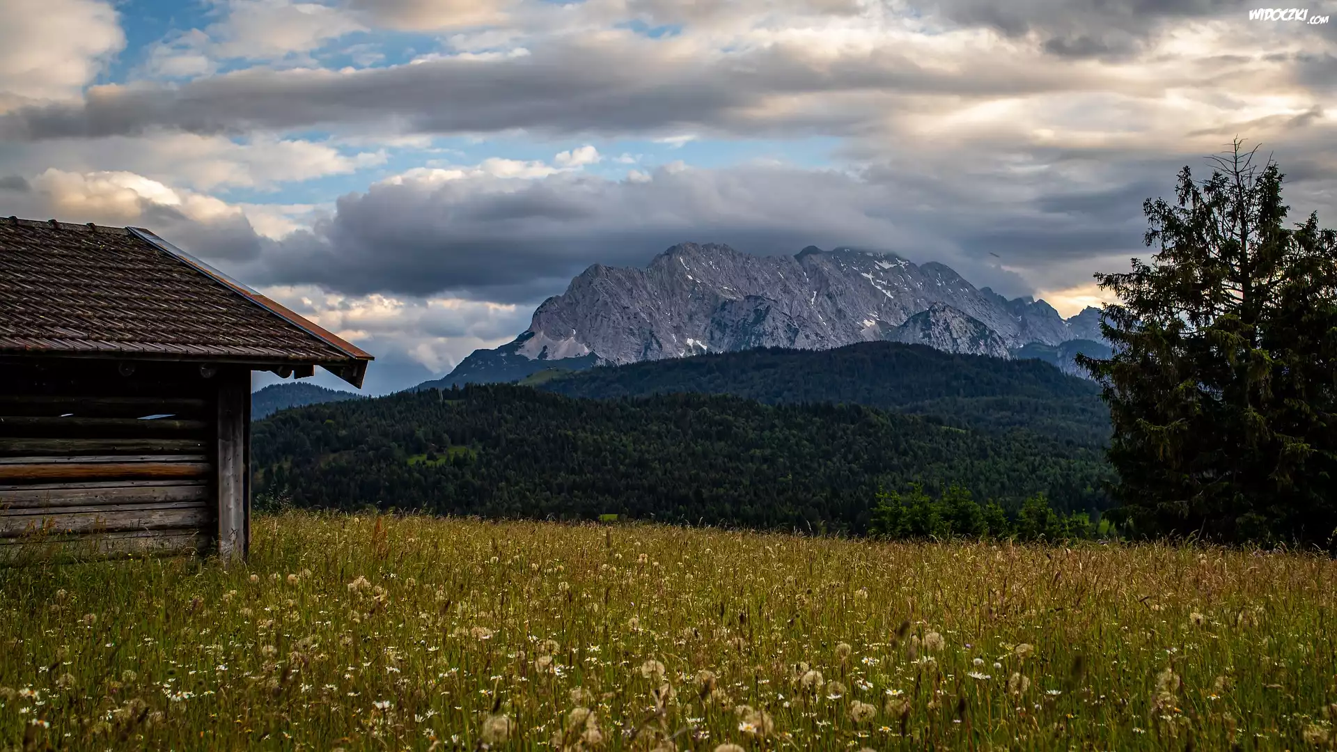 Zdjęcia, Łąka, Szopa, Góry, Chmury