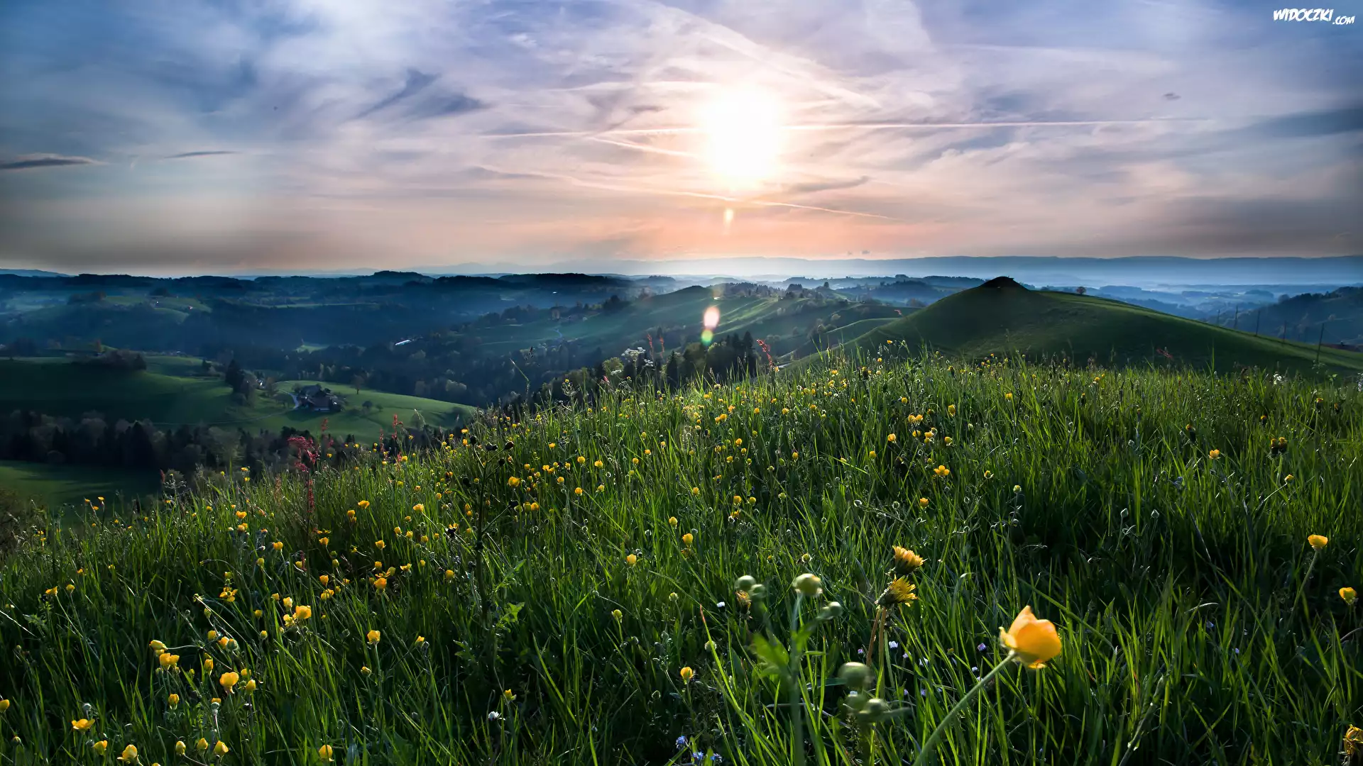 Zdjęcia, Zachód słońca, Łąka, Trawa, Kwiaty, Wzgórze, Niebo, Chmury