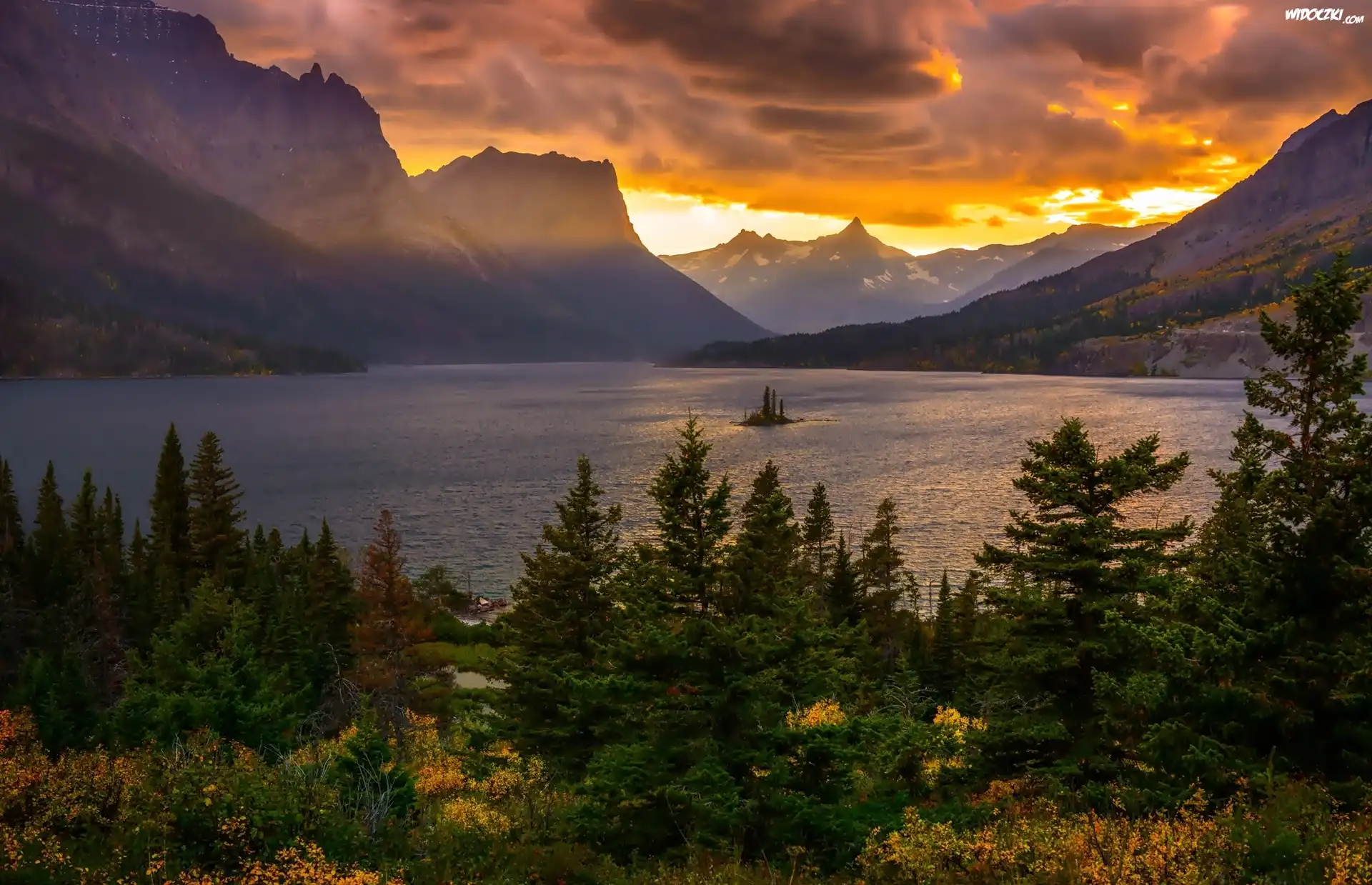 Zdjęcia, Chmury, Góry, Jezioro, Las, Wysepka