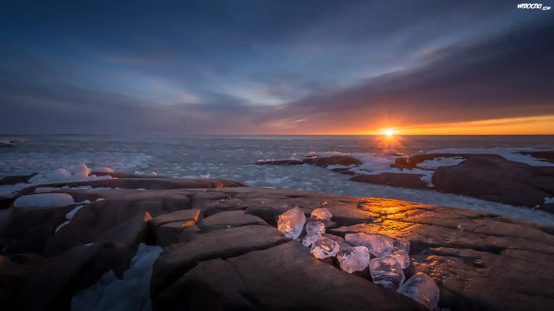 Ocean, Chmury, Zachód słońca, Odbicie, Skała, Zima, Lód