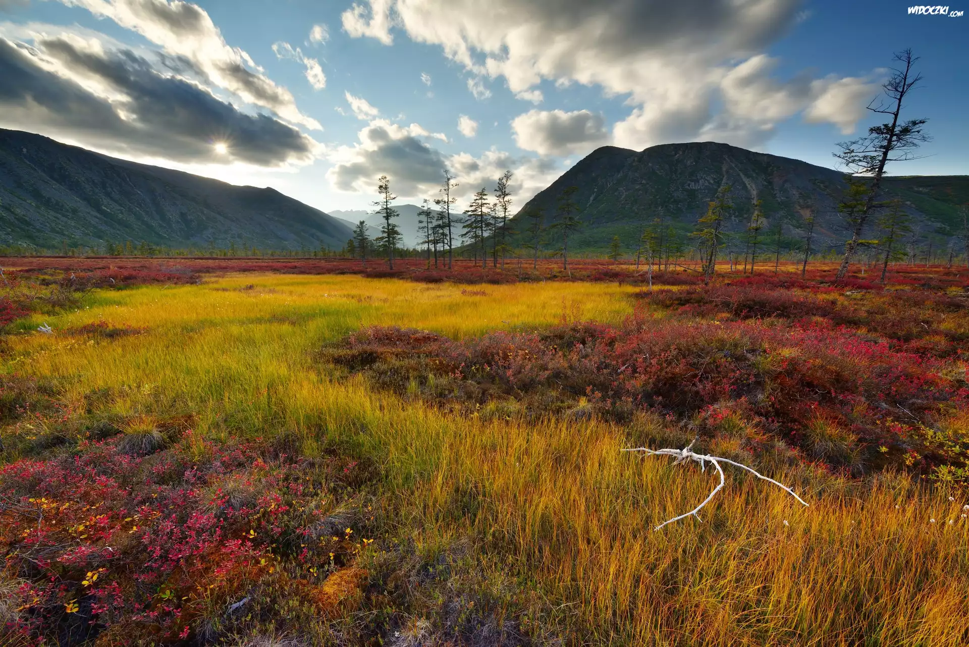 Rosja, Obwód magadański, Kołyma, Góry Kołymskie, Drzewa, Roślinność, Chmury