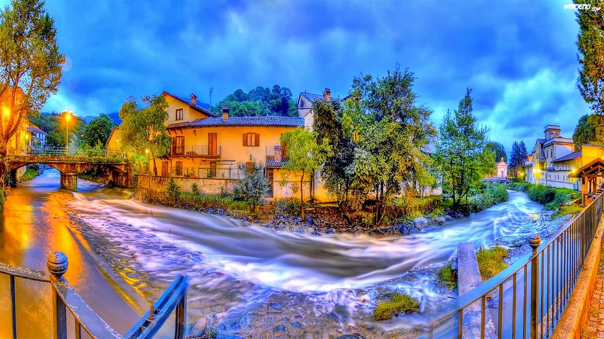 Chmury, Rzeka, Most, Miasteczko, Roślinność