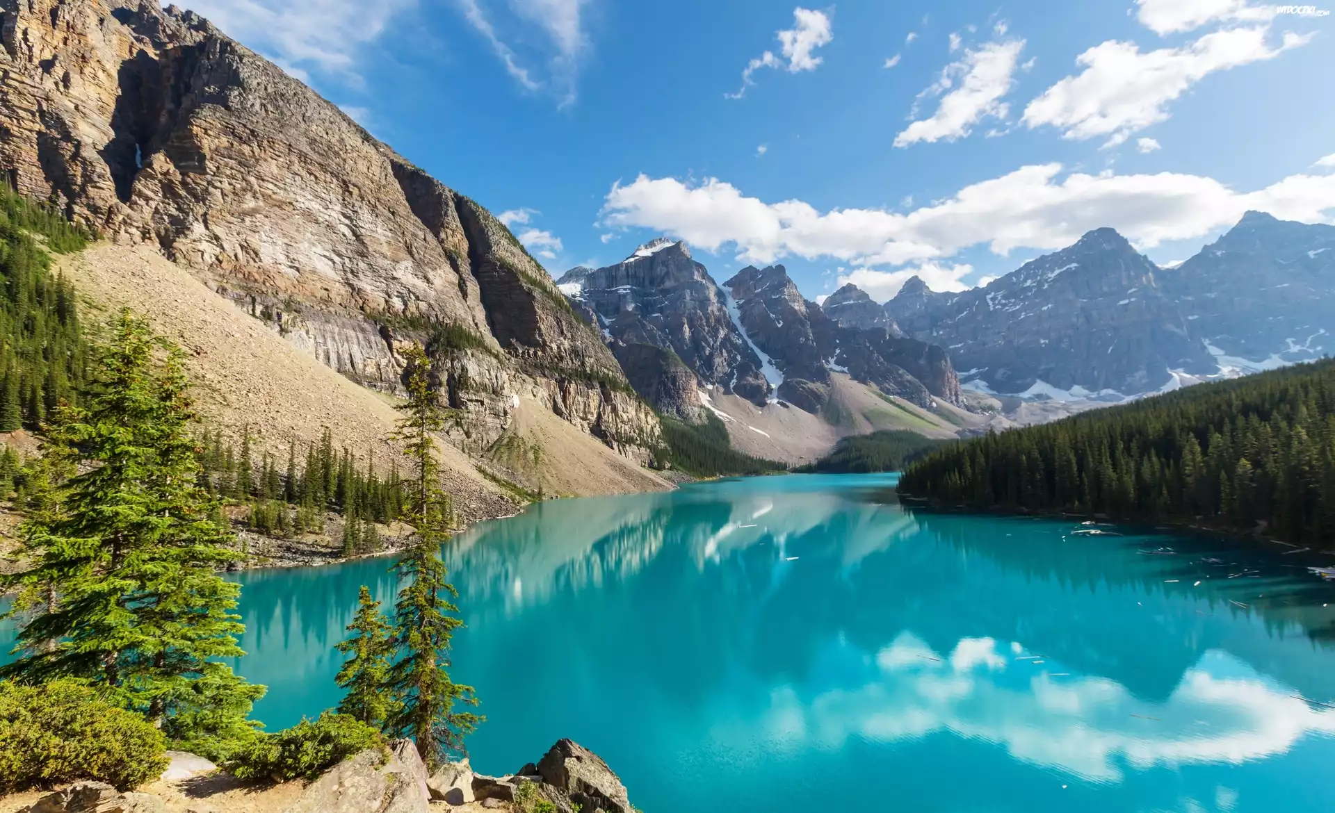 Zdjęcia, Kanada, Prowincja Alberta, Park Narodowy Banff, Jezioro Moraine, Drzewa, Chmury
