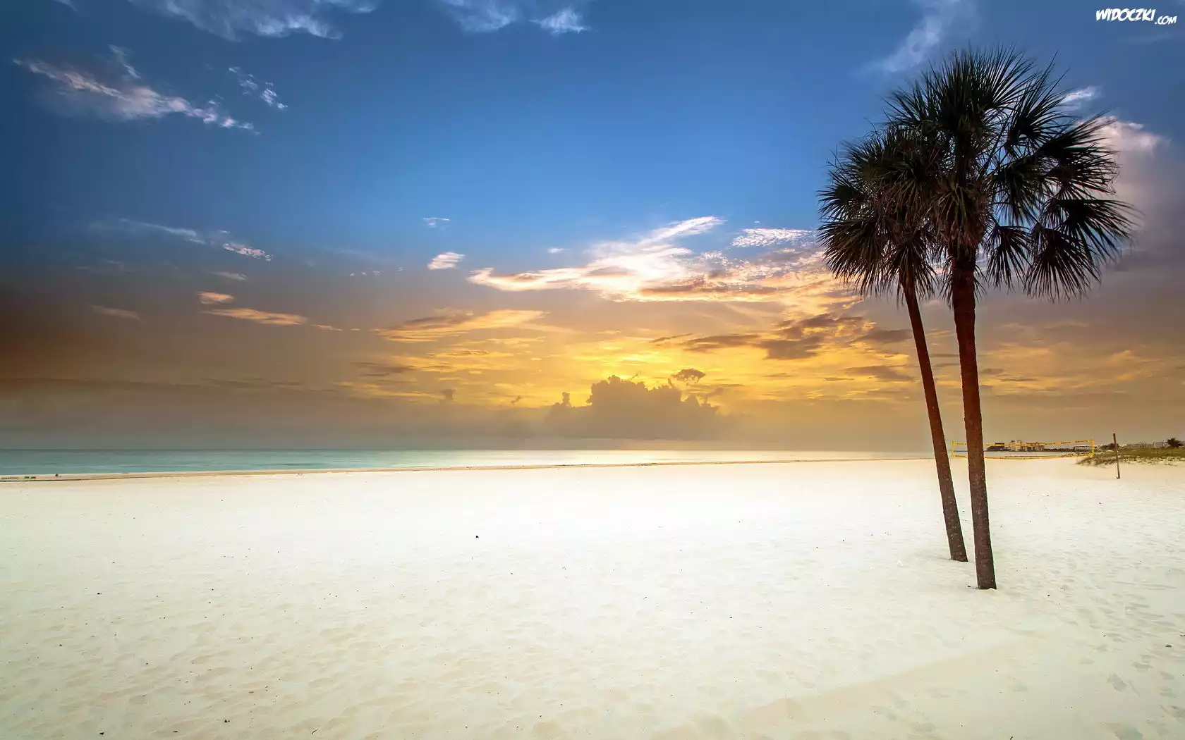 Niebo, Chmury, Wschód, Słońca, Plaża, Morze, Palmy