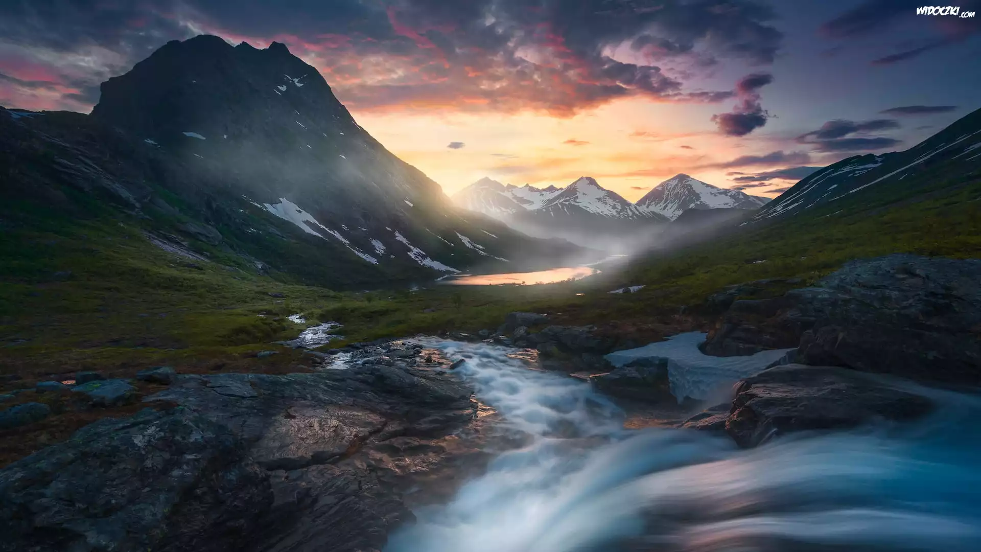 Zdjęcia, Góry, Chmury, Rzeka Rauma, Jezioro, Dolina, Romsdalen, Norwegia