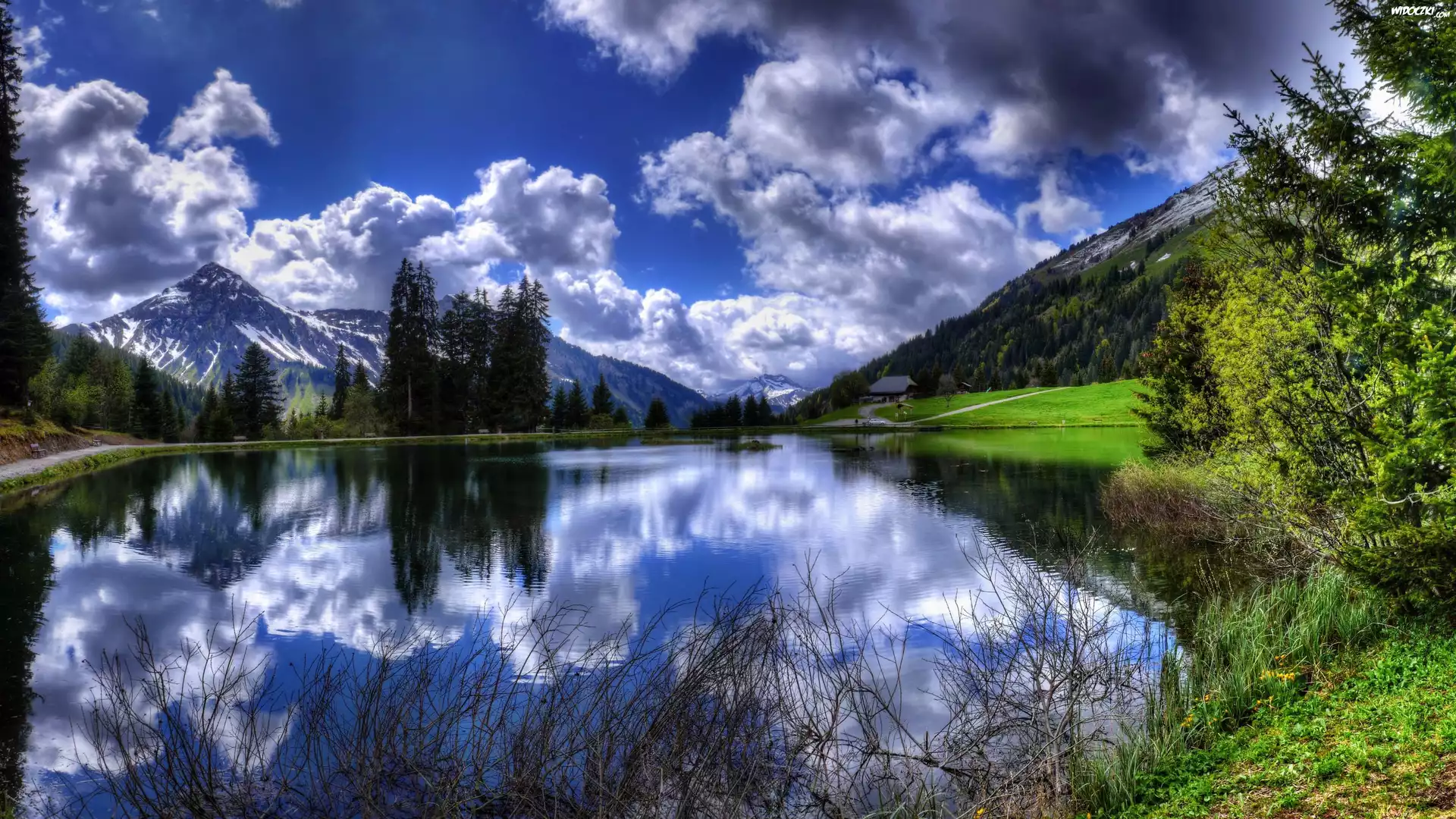 Zdjęcia, Chmury, Góry, Jezioro, Odbicie, Drzewa