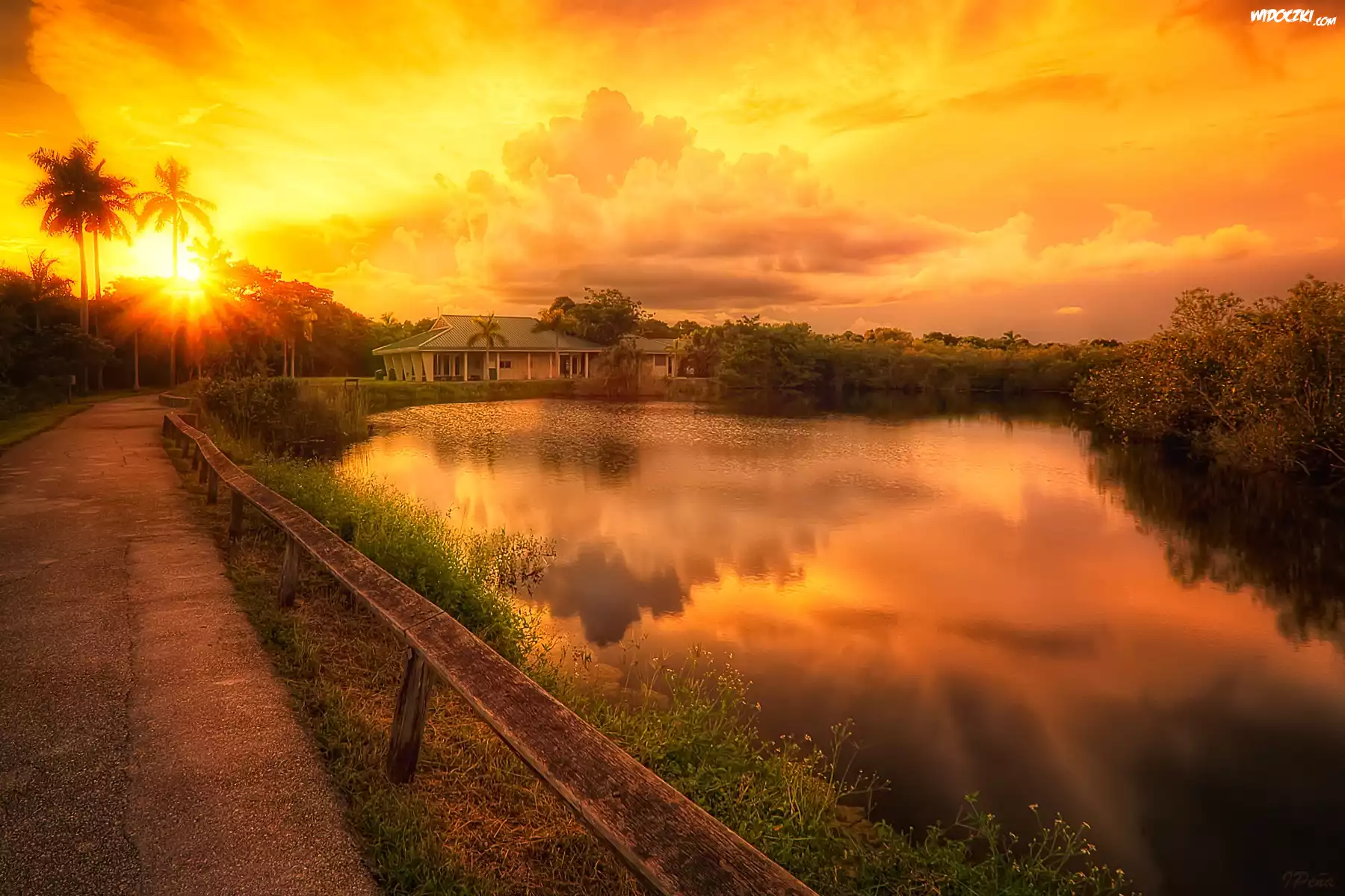 Chmury, Jezioro, Zachód, Słońca, Palma, Dom