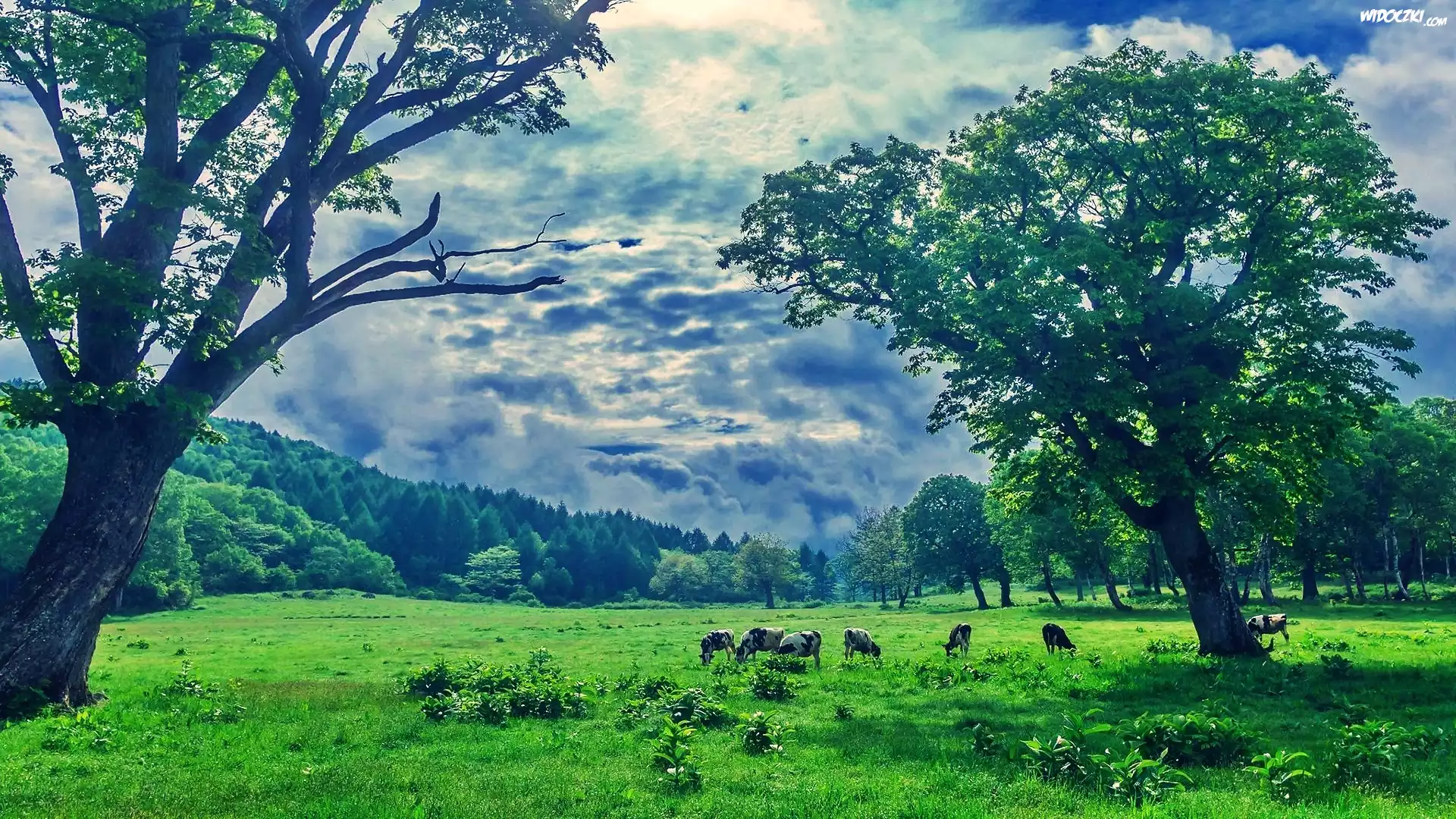 Zdjęcia, Łąka, Pastwisko, Drzewa, Chmury, Krowy