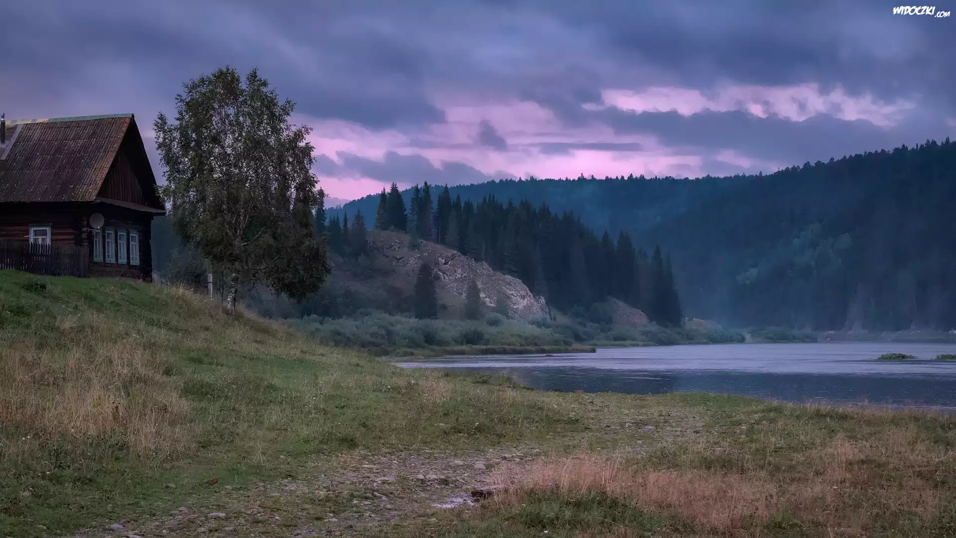 Chmury, Wieś Kyn, Drewniany, Dom, Brzoza, Rzeka Czusowaja, Wzgórza, Trawy, Skały, Ural, Kraj Permski, Rosja |