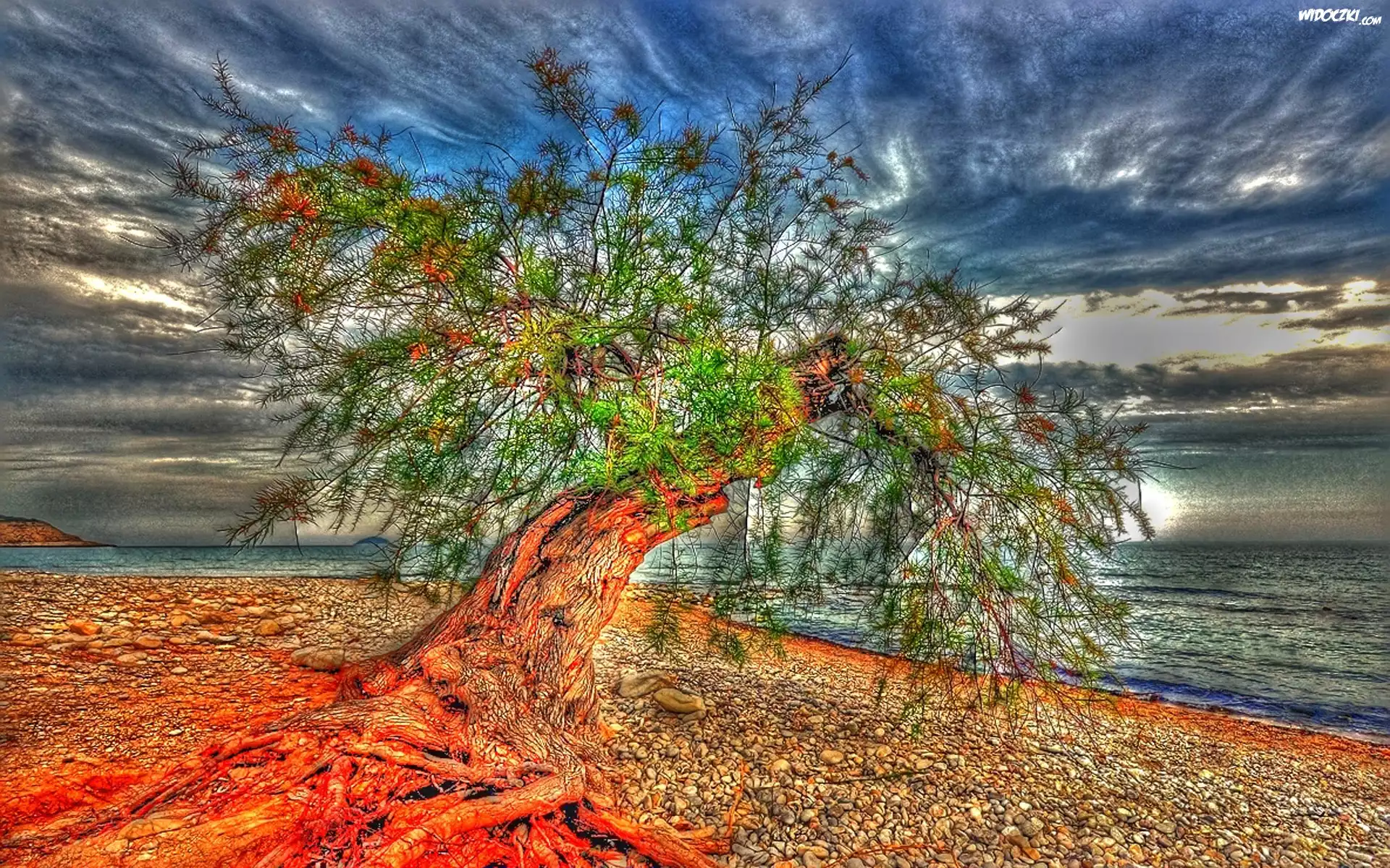 Zdjęcia, Chmury, Morze, Kamienista, Plaża, Drzewo