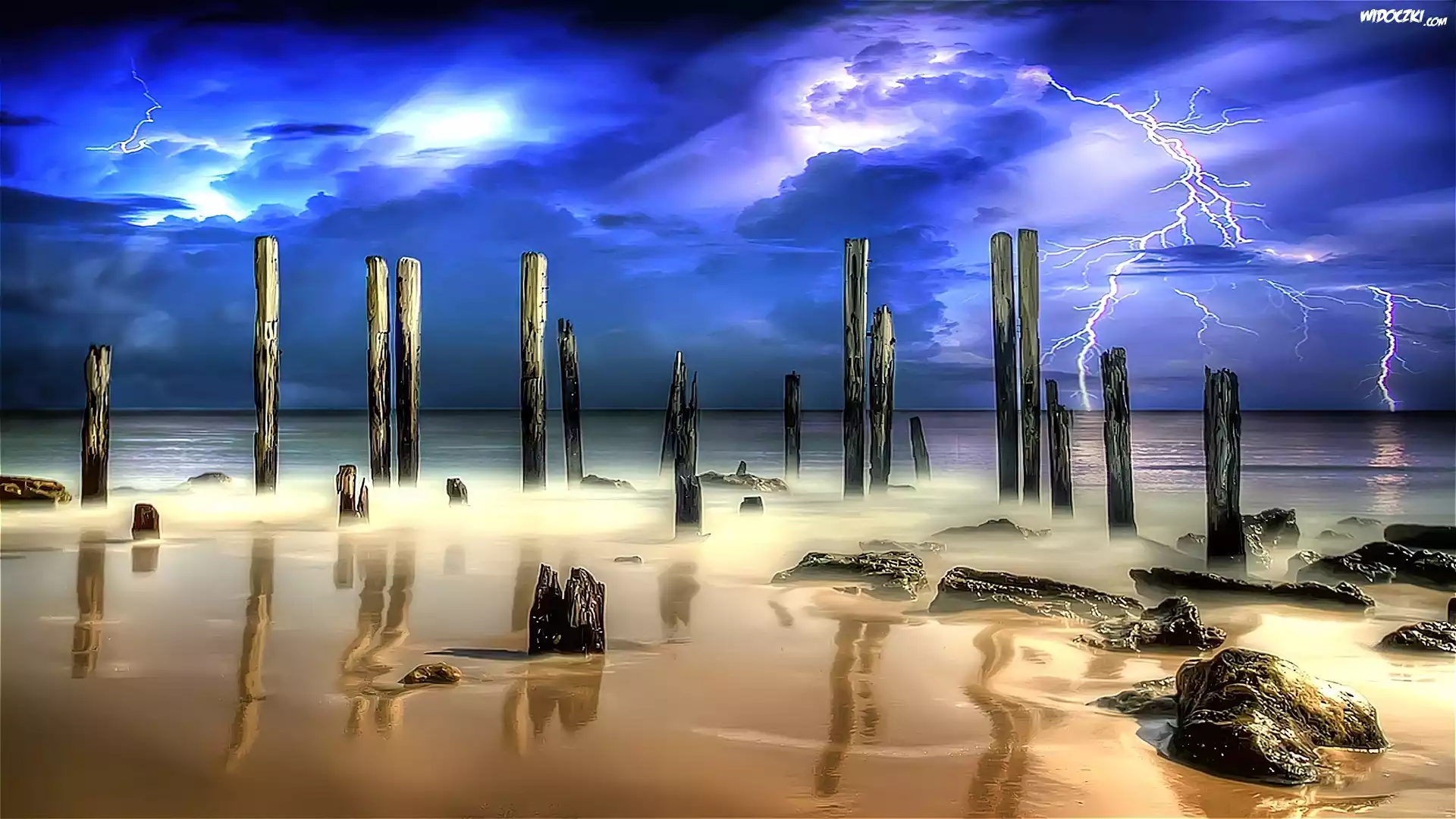 Zdjęcia, Chmury, Burza, Morze, Plaża, Pale