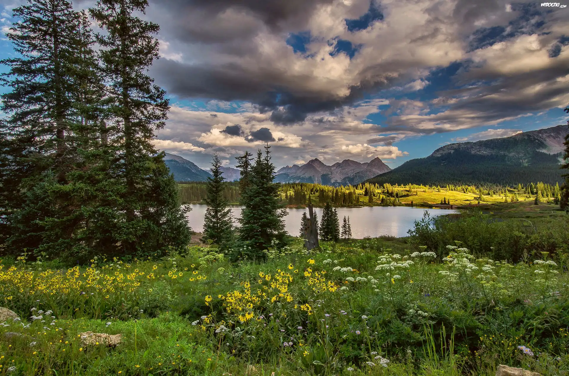 Chmury, Góry, Jezioro, Łąka, Polne Kwiaty