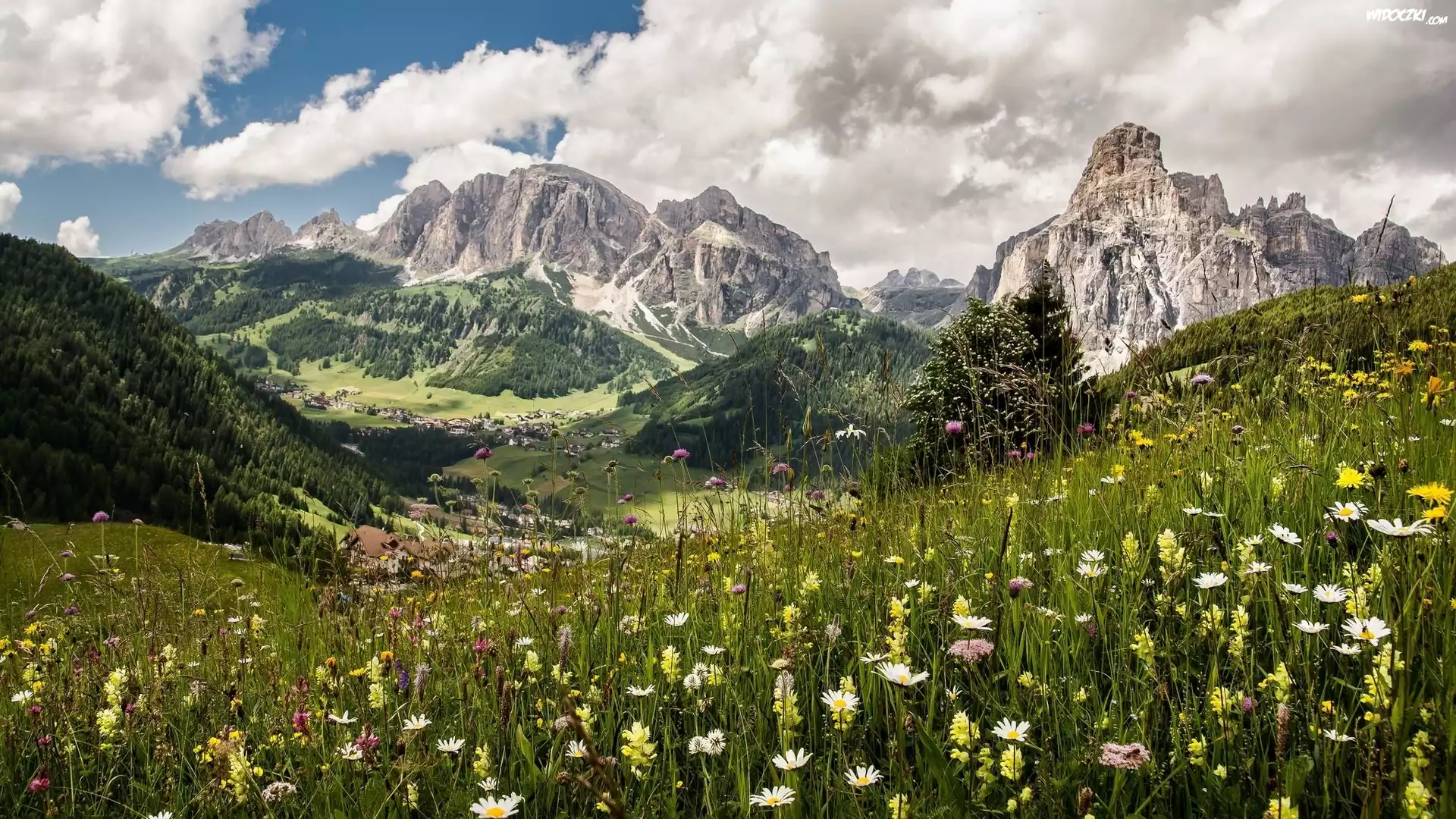 Zdjęcia, Góry Dolomity, Góra Sassongher, Pralongia, Włochy, Łąka, Dolina, Domy, Chmury