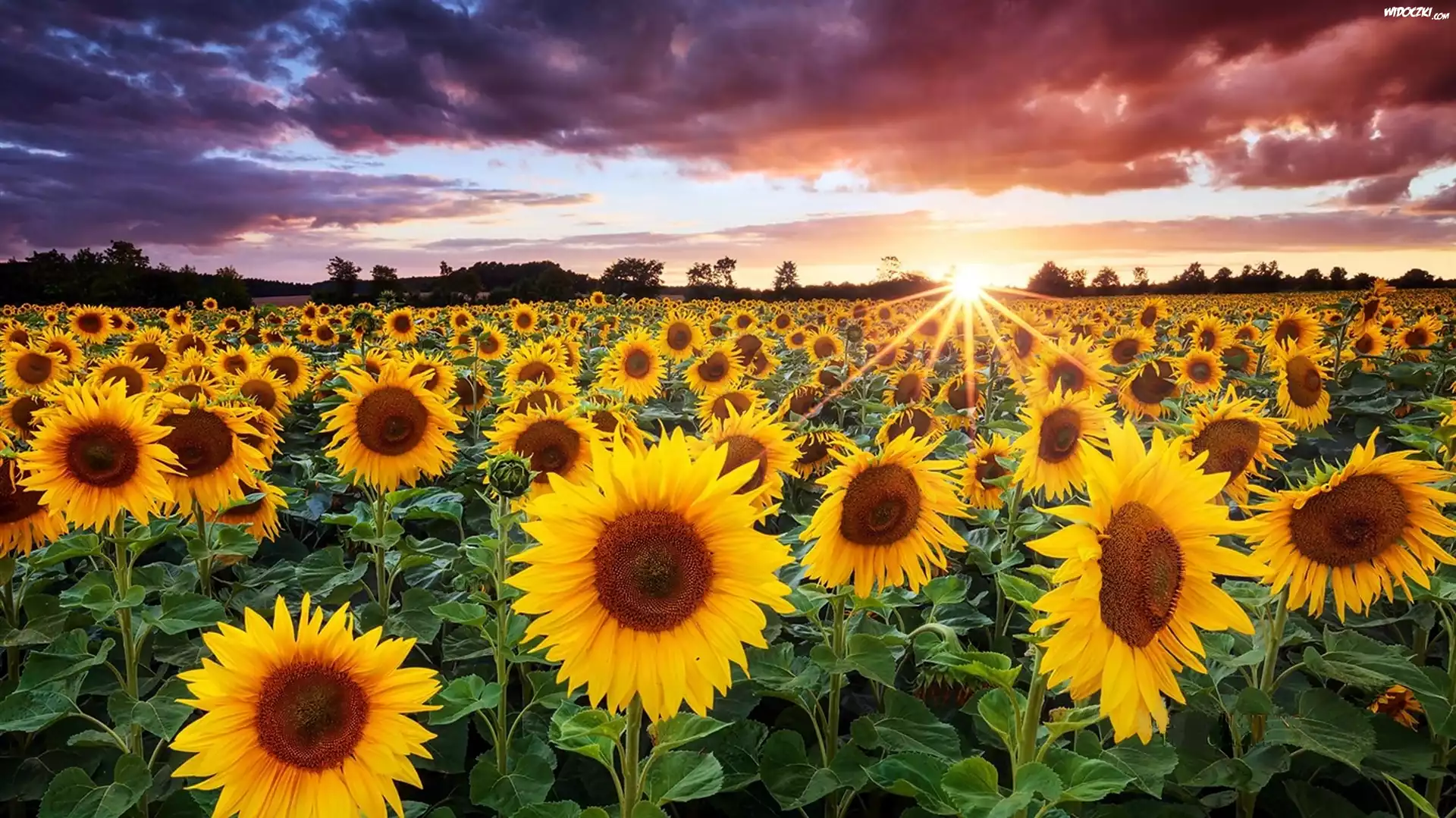 Chmury, Słoneczniki, Pole, Promienie, Słońca