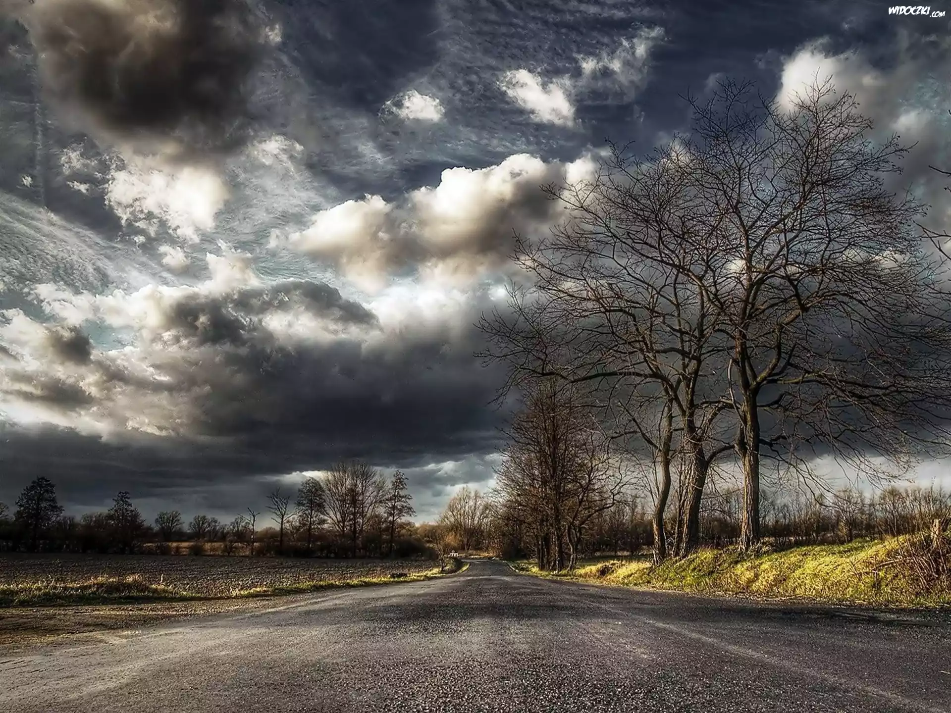 Chmury, Droga, Drzewa, Przebijające, Światło