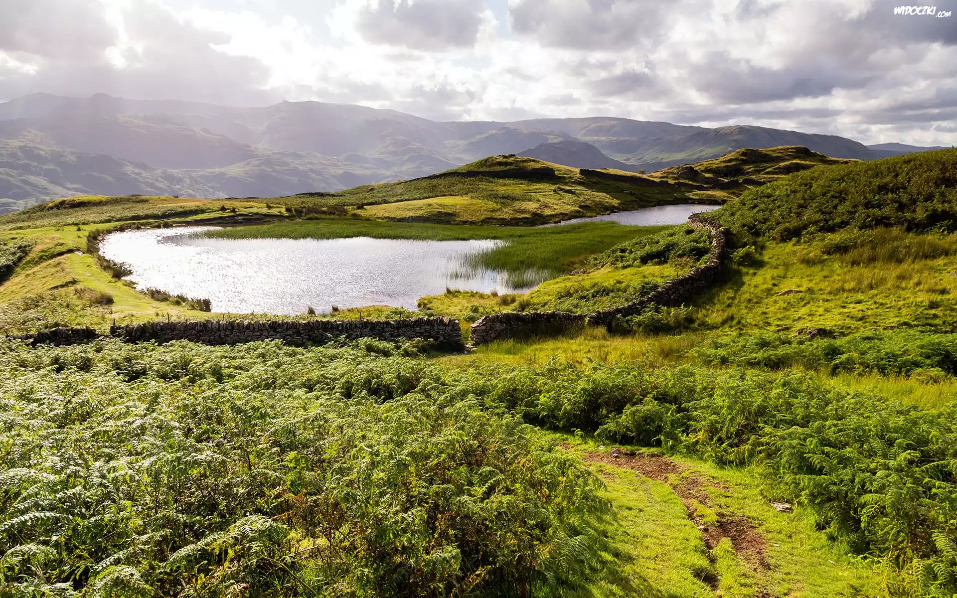 Zdjęcia, Niebo, Chmury, Góry, Wzgórza, Jezioro, Kamienny, Murek, Roślinność
