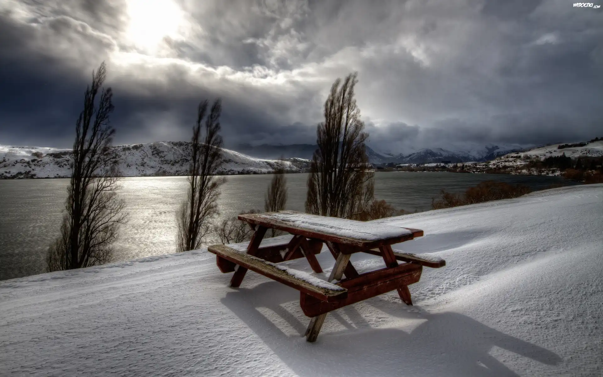 Zdjęcia, Chmury, Góry, Rzeka, Ławka