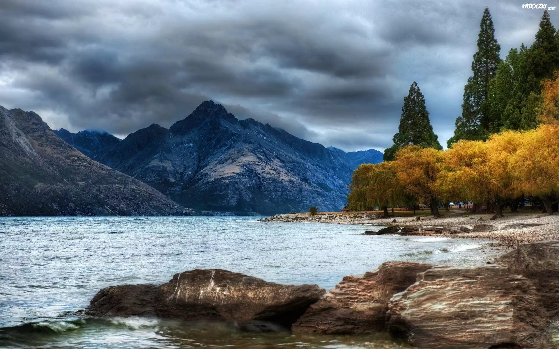 Zdjęcia, Chmury, Las, Rzeka, Skały