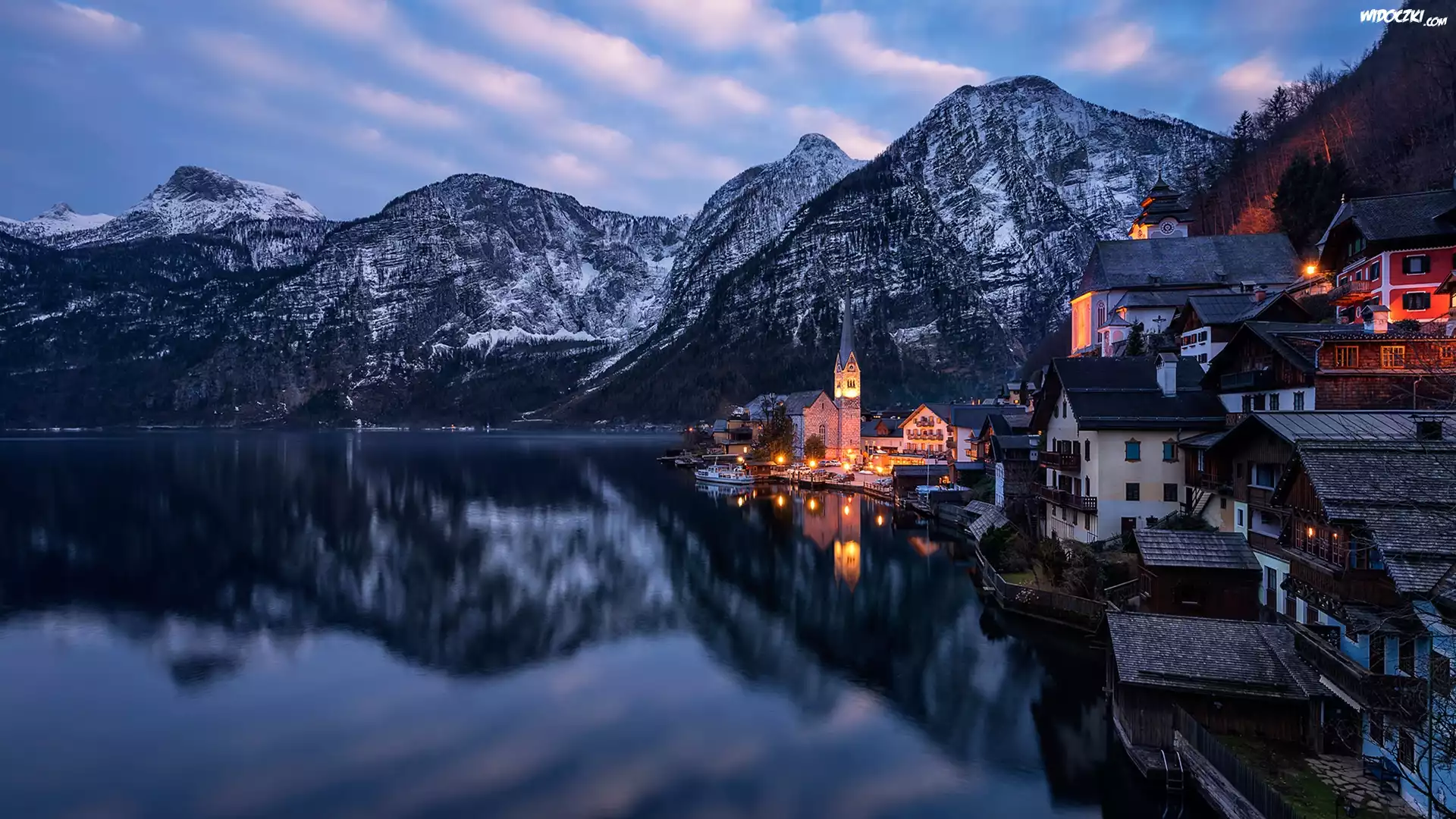 Zdjęcia, Austria, Hallstatt, Góry, Alpy Salzburskie, Jezioro Hallstattersee, Domy, Wieczór, Chmury