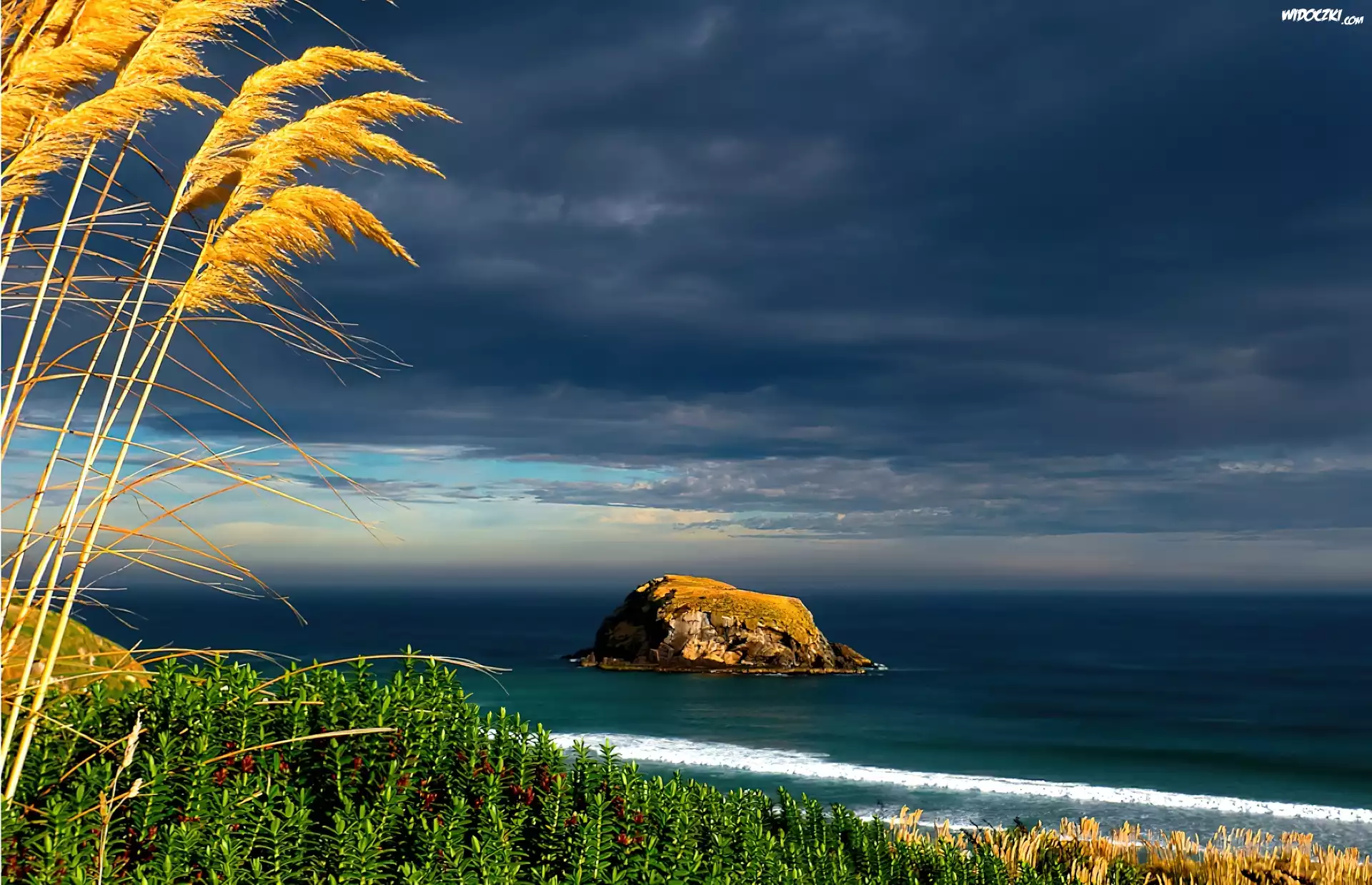 Zdjęcia, Chmury, Morze, Skała, Rośliny