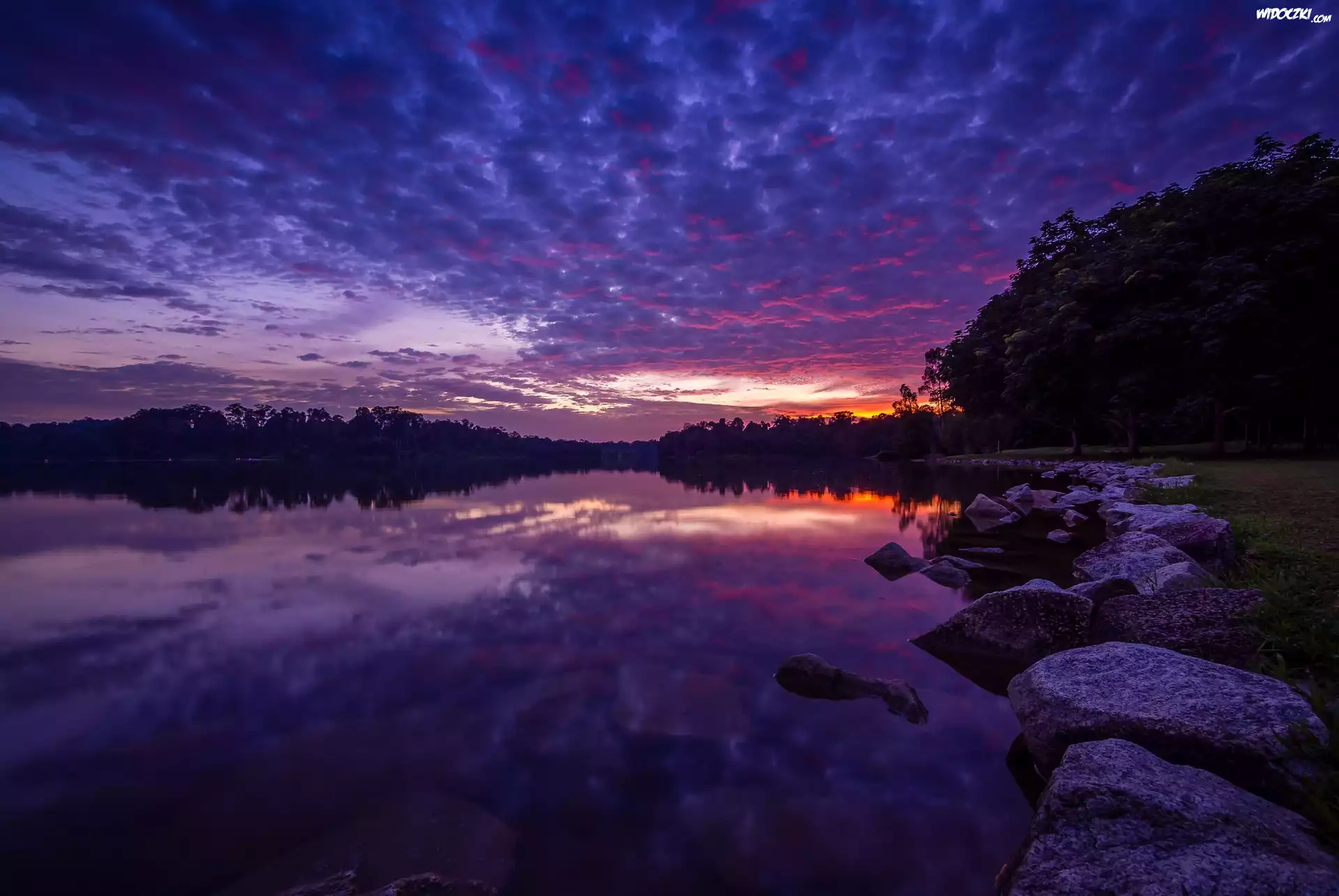Chmury, Niebo, Lasy, Jezioro, Skaly, Las