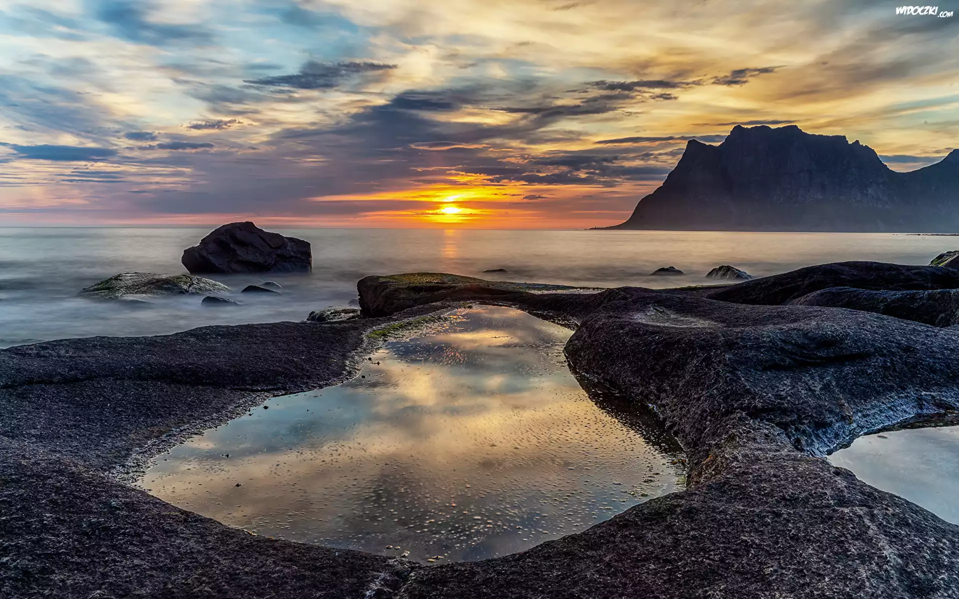 Zdjęcia, Wybrzeże, Góry, Skały, Niebo, Chmury, Plaża, Uttakleiv Beach, Morze, Kamienie, Lofoty, Norwegia