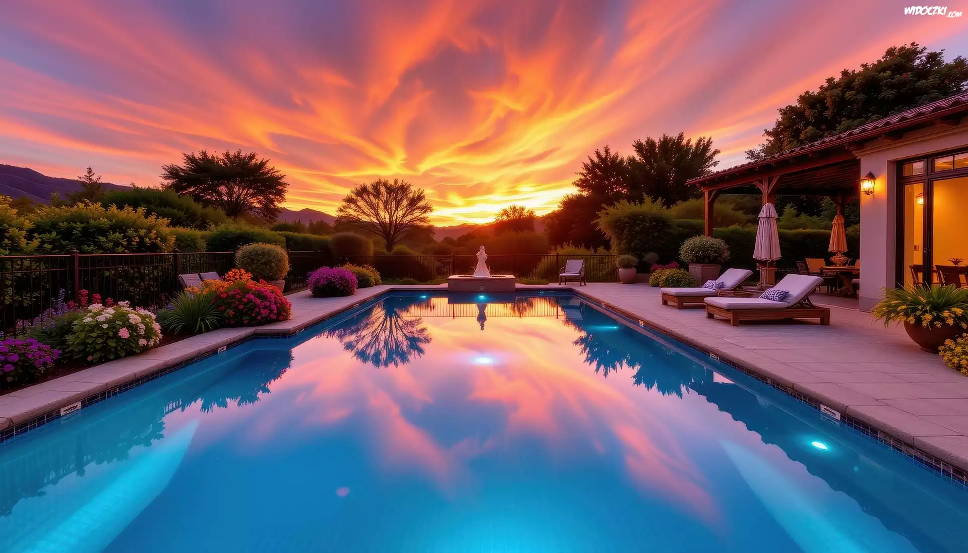 Basen, Leżaki, Drzewa, Chmury, Zachód słońca