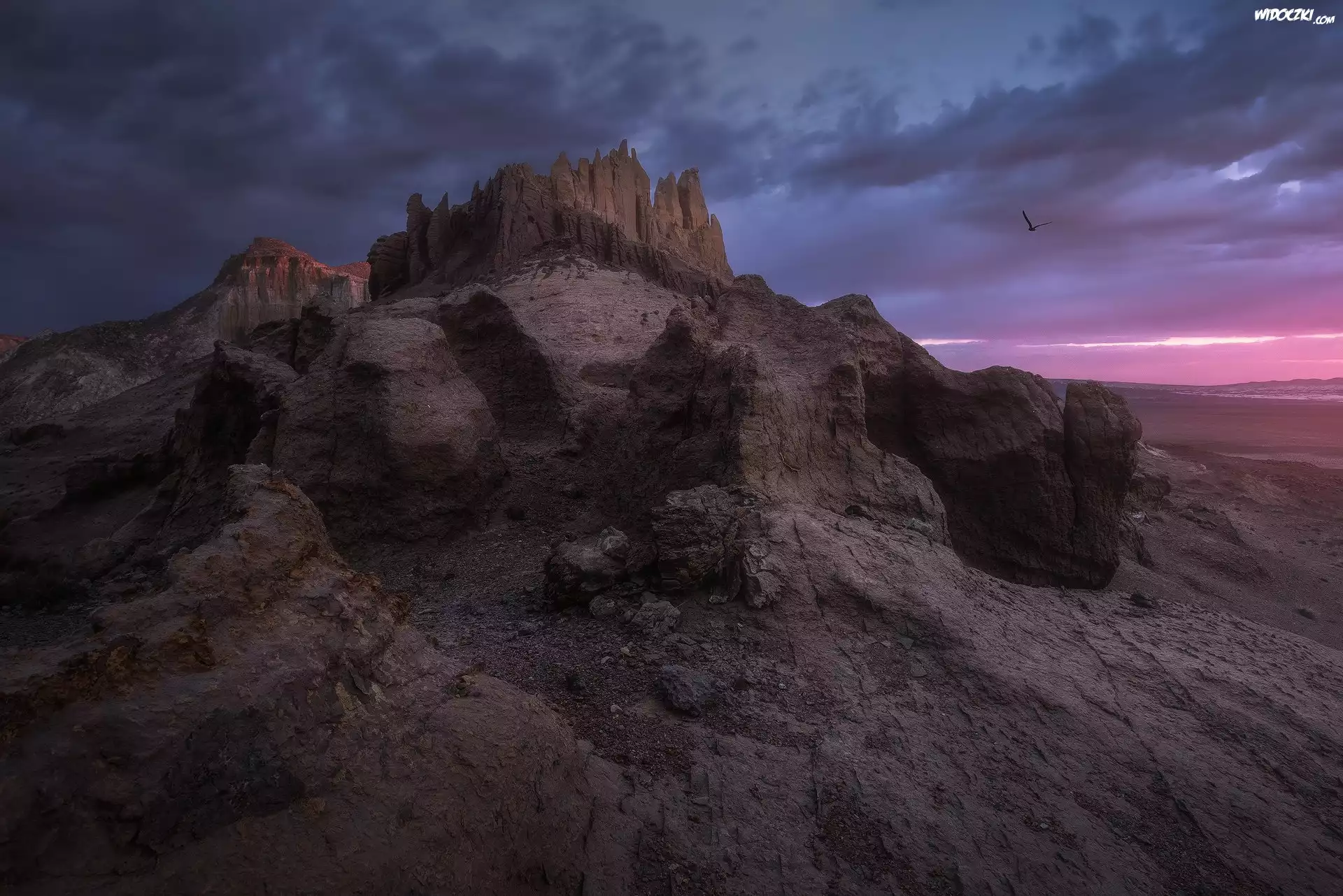 Zdjęcia, Góry, Skały, Chmury, Zachód słońca, Ptak, Płaskowyż Ustiurt, Obwód mangystauski, Kazachstan