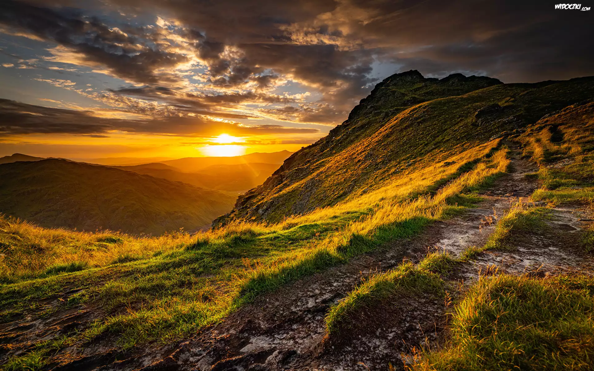 Zdjęcia, Szkocja, Ben Vorlich, Góry, Wzgórza, Trawa, Chmury, Zachód słońca